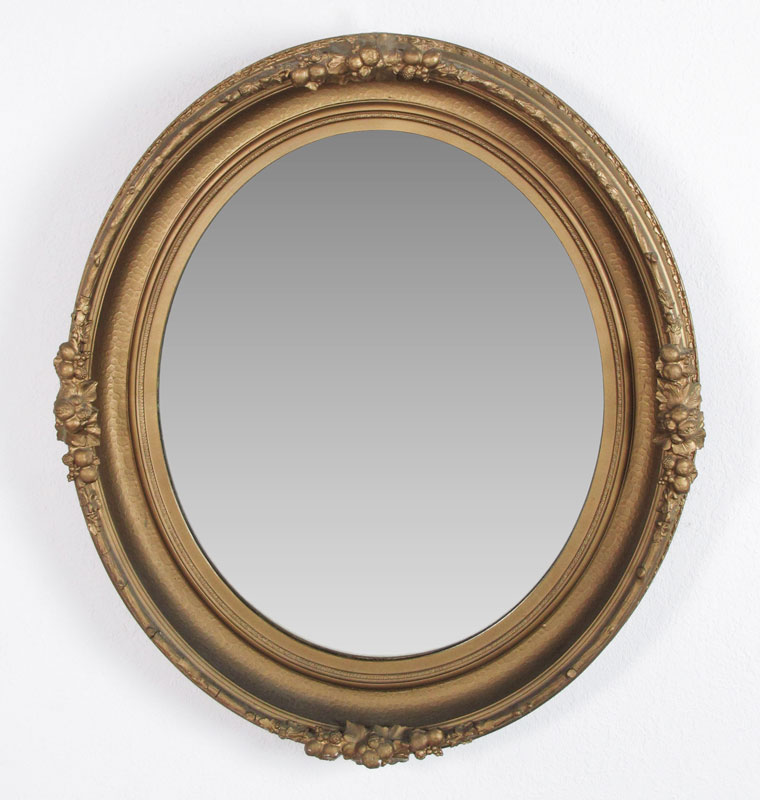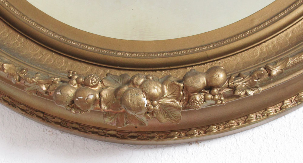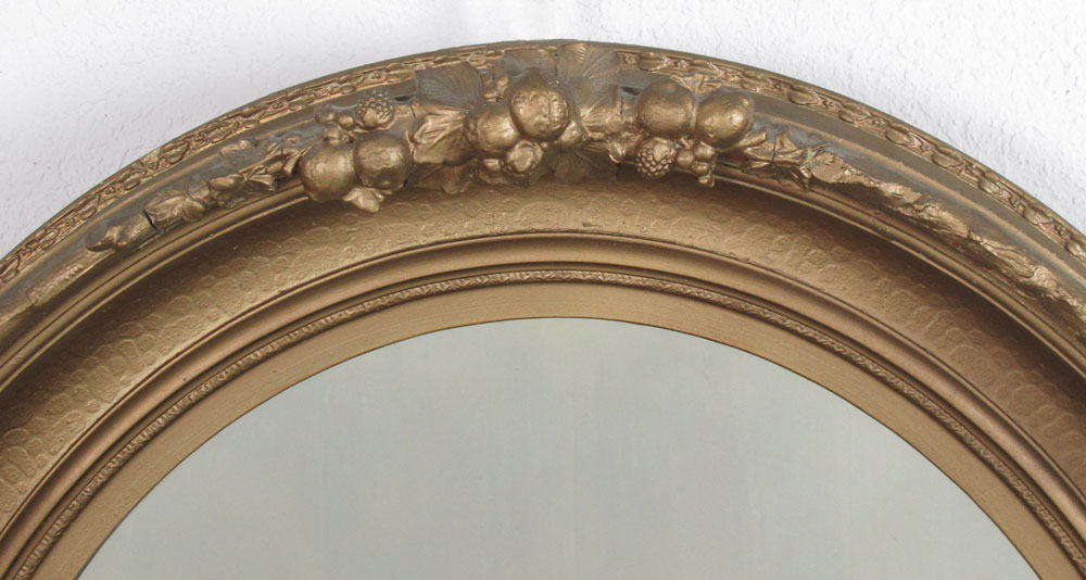 LARGE 19th C GOLD GILT GESSO FRAME: Oval deep dish frame with fruit, nuts and leaf embellishments, overall approx. 32'' x 28'', interior opening 23 1/2'' x 19 1/2'', currently holding a mirror.