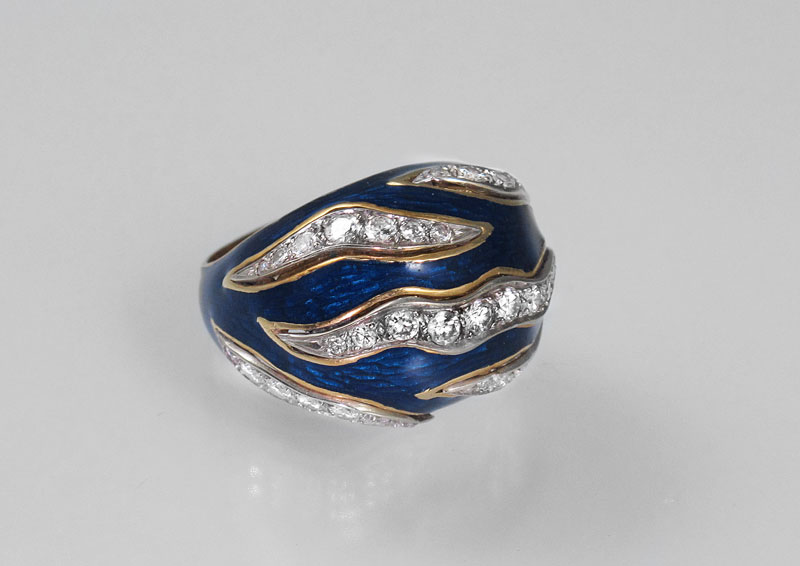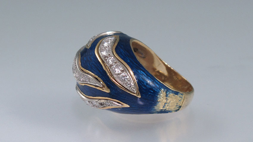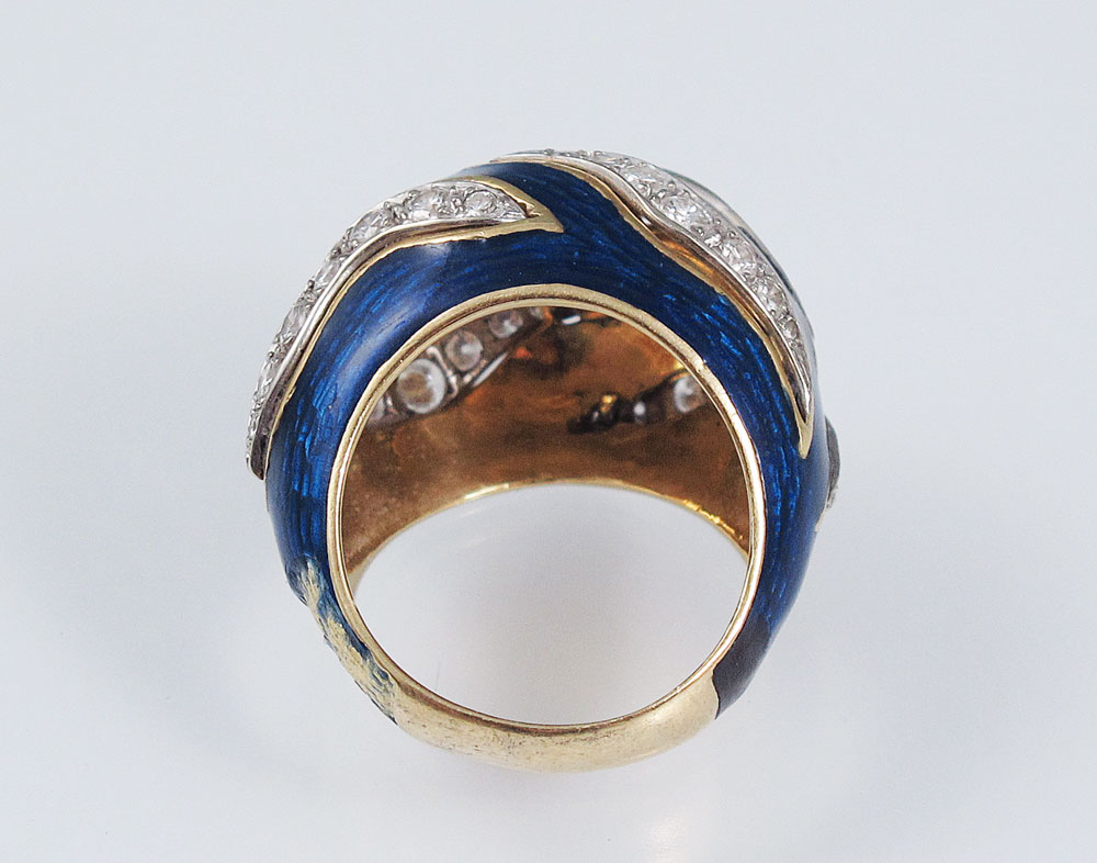 18K GOLD COBALT ENAMEL AND 1.75 CTW DIAMOND RING: 18K yellow gold ring with cobalt guilloche enamel. The enamel has been repaired on one side near shank. The enamel is missing on the other side near shank. 18K white gold trim contains 37 round brilliant cut diamonds. Weight: 1.75 Ct. Approx. Rated VS in clarity and G-H in color. High profile dome. Weight: 16.1 grams. Size: 7.5