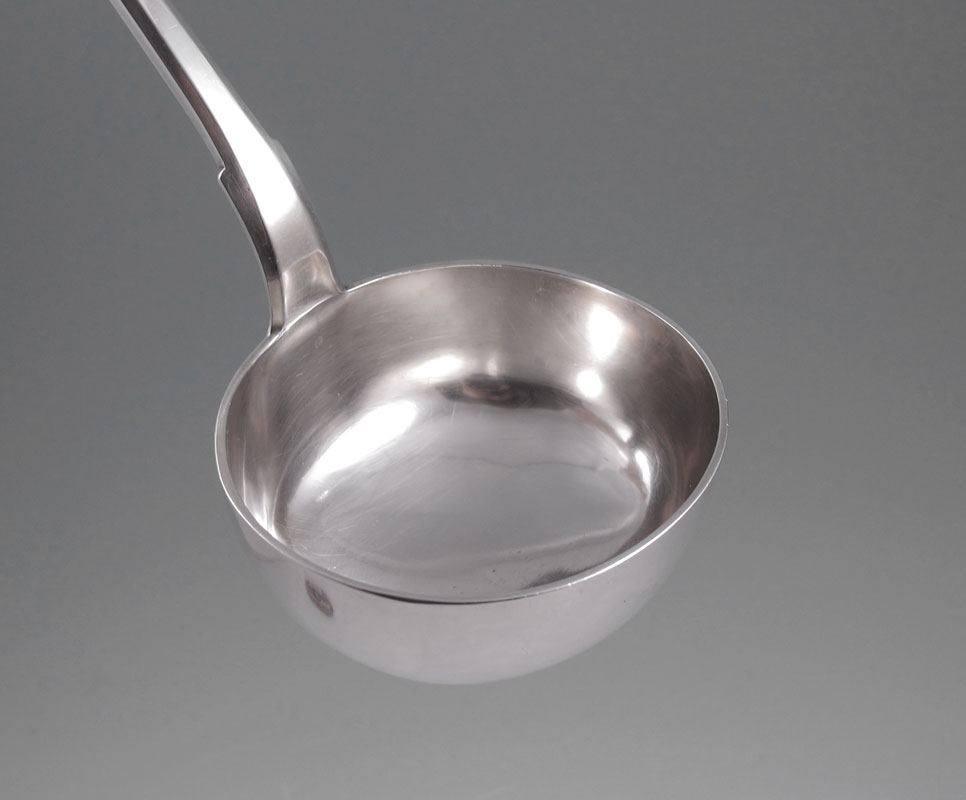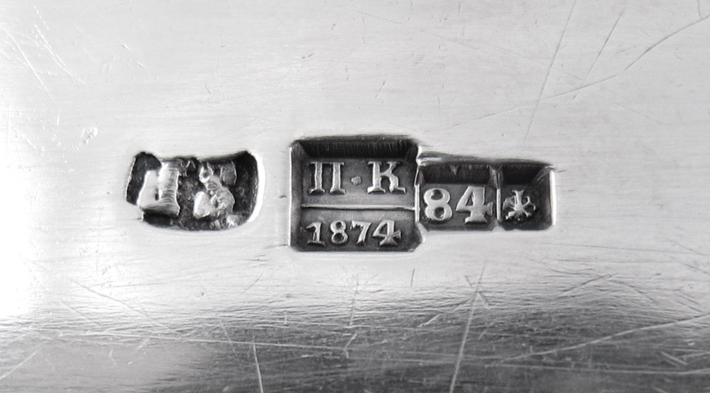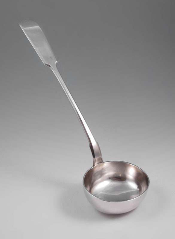 SAMUEL FILANDER 1874 RUSSIAN SILVER LADLE: Hallmarked with unknown St. Petersburg assay marks, dated 1874 and Samuel Filander hallmark. 84 zolotnik. 14 1/4'' long. Approx. 9.4 troy oz.