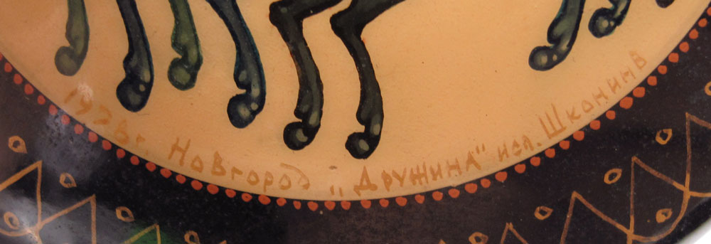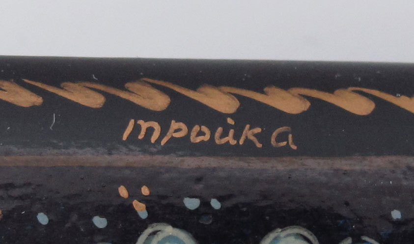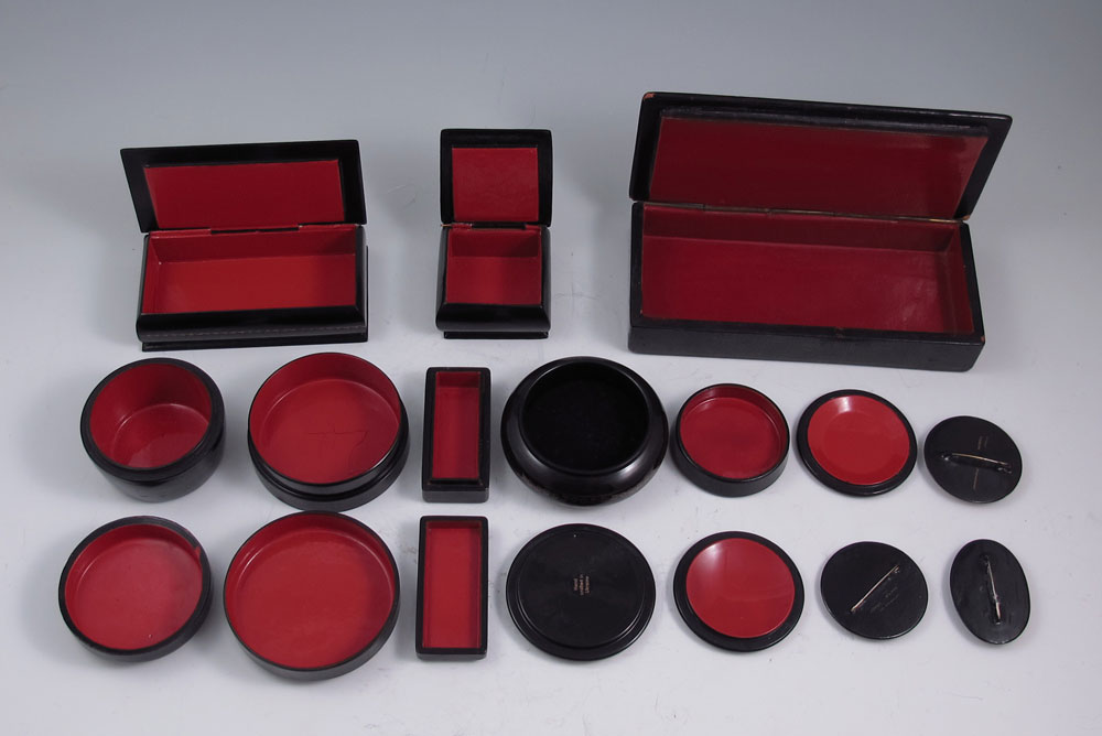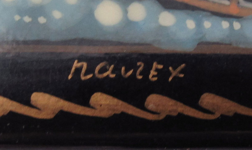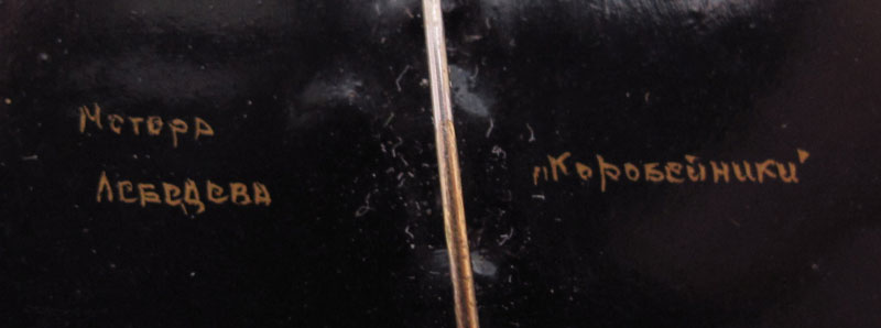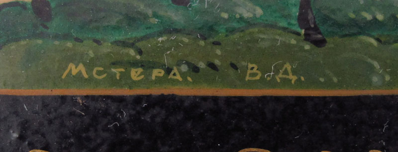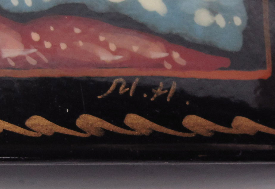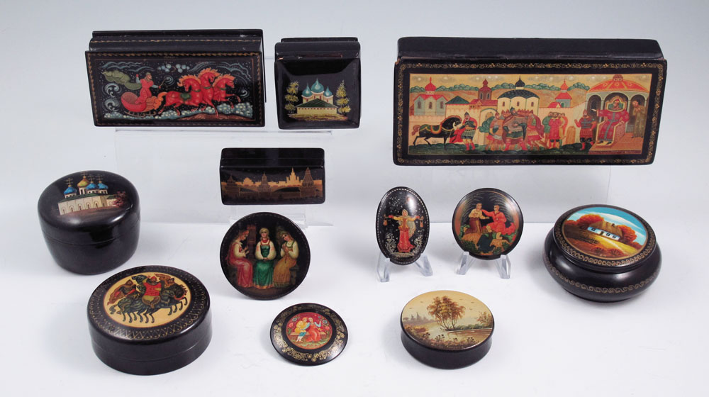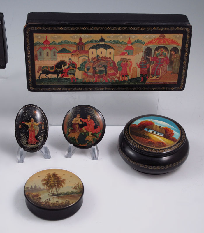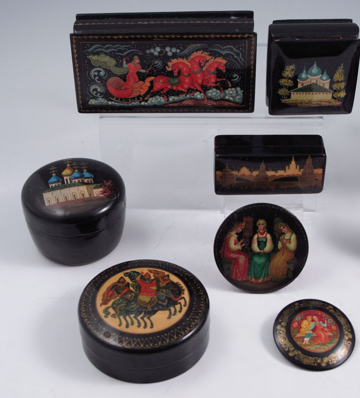 COLLECTION OF 8 RUSSIAN PAINTED LACQUER BOXES: To include 8 20th century boxes, 3 hinged, 5 with removable lids. Assorted designs and artists. Sold with 3 pins and 1 loose lid. Larges box measures 1 1/4'' h. x 7 1/4'' x 3 3/8''.