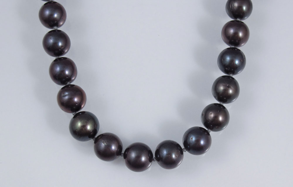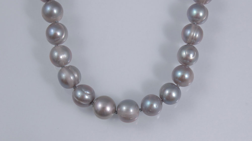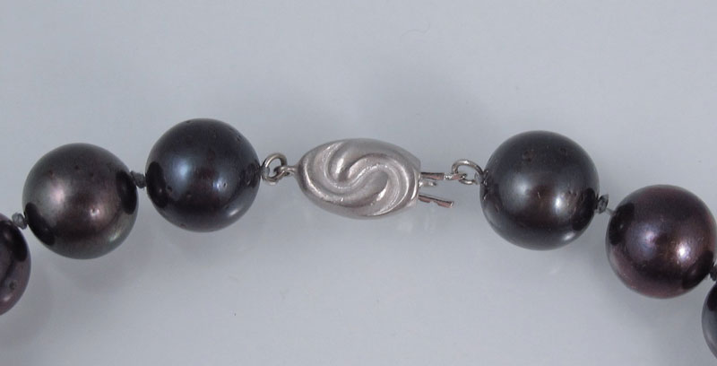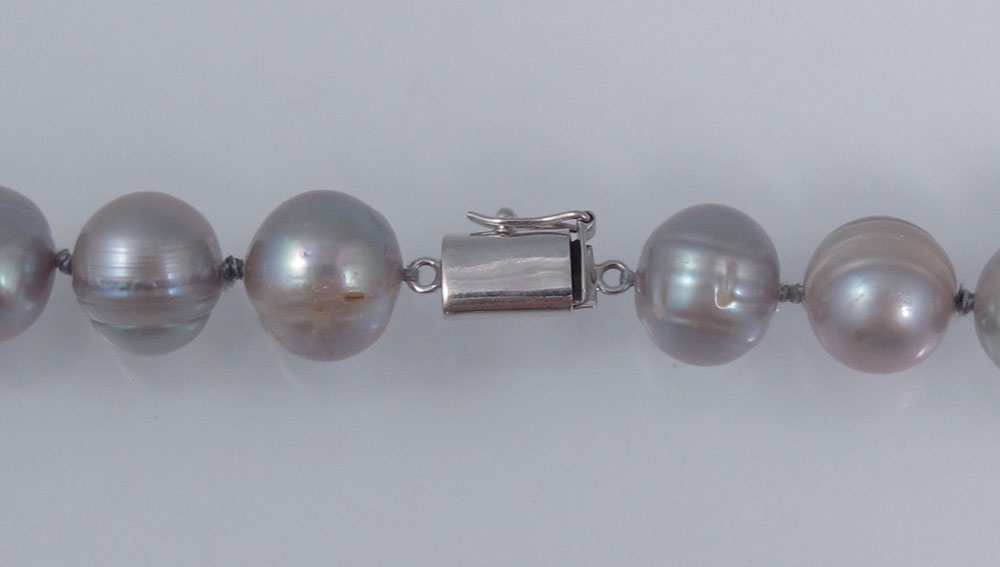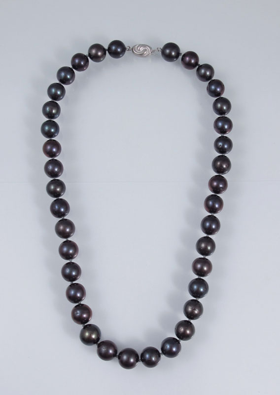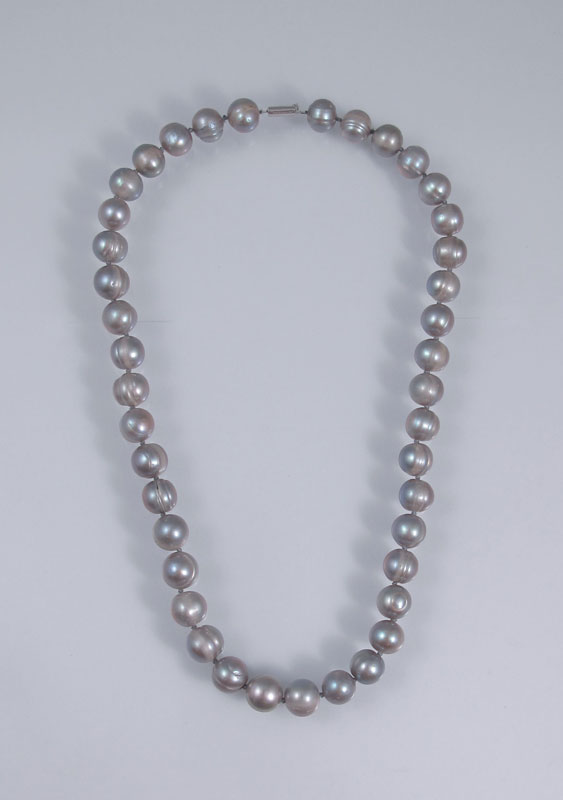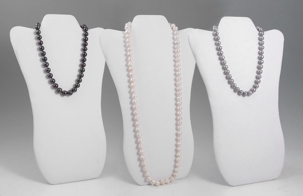 3 COLOR 3 STRANDS OF PEARL NECKLACES: 1) An 18'' strand of 10.00 mm silver circle pearls. 18K white gold clasp. 2) A 34'', 10.00-11.00 mm strand of white circle pearls. No clasp. 3) A 20'', 10.00-11.00 mm strand of black pearls with 14K white gold clasp.