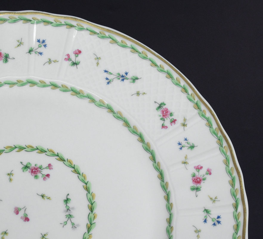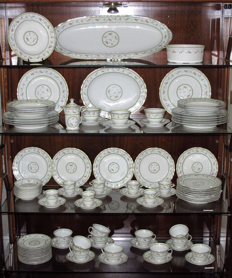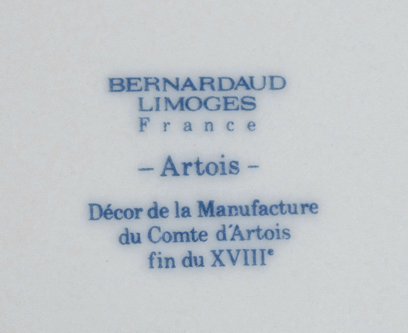 FRENCH LIMOGES ARTOIS PATTERN FINE CHINA: Bernardaud & Co. fine china in a crisp fresh design. Approx. 95 pieces to include a 22'' fish platter, souffle dish, 12 1/2'' platter, 11 dinner plate (10 1/2''), 13 salad plates, 11 bread plates, 8 soup bowls, 8 dessert bowls, 14 cups, 12 saucers, 7 demi cups, and 8 demi saucers.