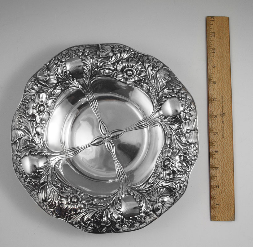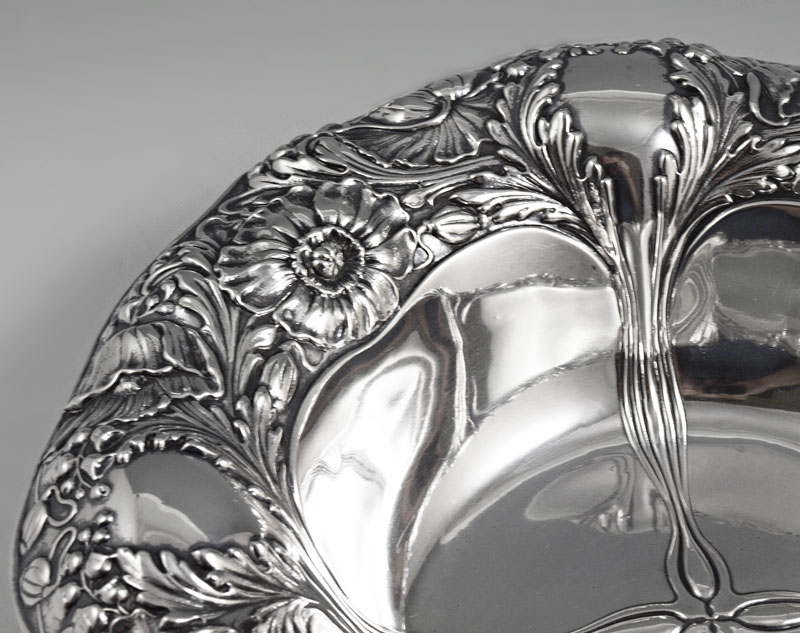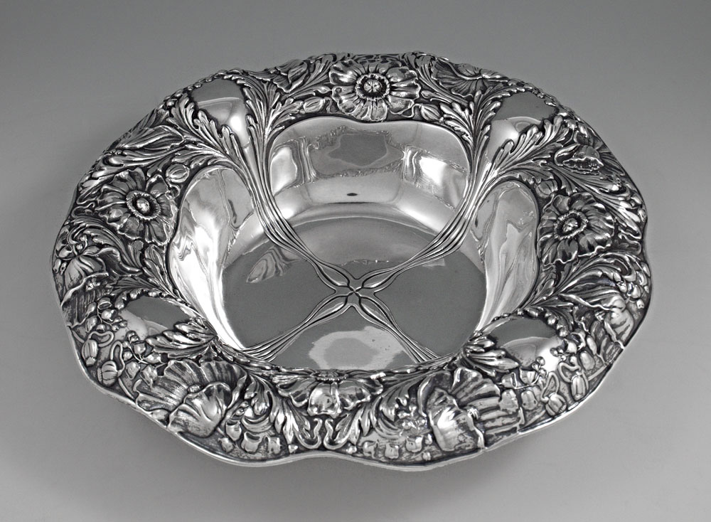 GORHAM FLORAL ART NOUVEAU REPOUSSE BOWL: Floral repousse design, marked with Gorham marks, Sterling, A2649. 2 1/4'' h. x 10 3/4'' dia. Approx. 11.8 troy oz.