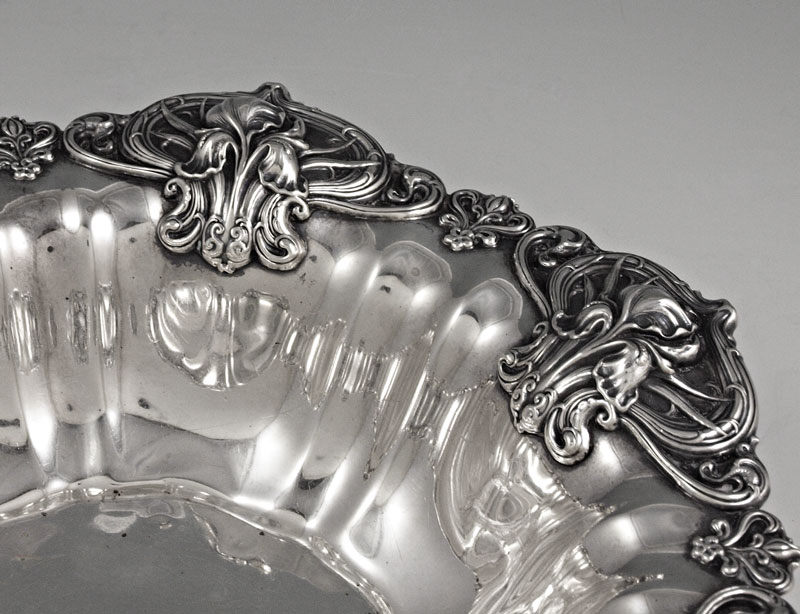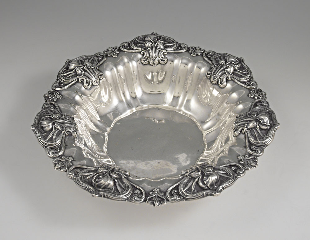 WHITING ART NOUVEAU REPOUSSE STERLING BOWL: Repousse design of iris flowers rim and fluted bowl. Marked with Whiting stamp, Sterling 6538. 2 1/4'' h. x 9 1/2'' dia. Approx. 11 troy oz.