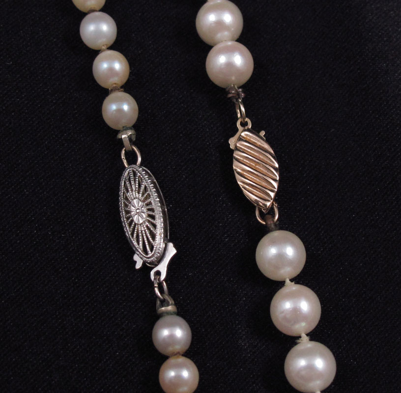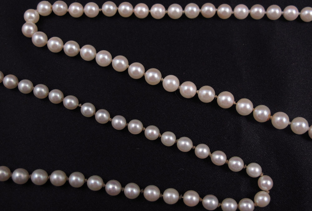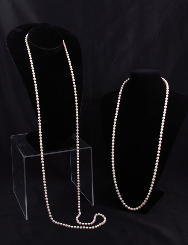 2 PEARL STRAND NECKLACES: 30'' and 48''. 30'' strand of 6.00 mm cultured pearls. Light cream color. blemished. Low/Medium luster. 14K yellow gold clasp. 40'' strand of 4.25 mm cultured pearls. Light cream color. blemished. Low/Medium luster. 14K white gold clasp.