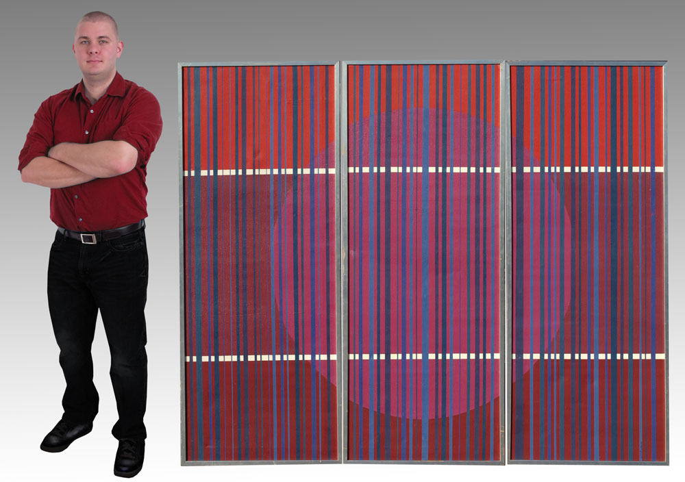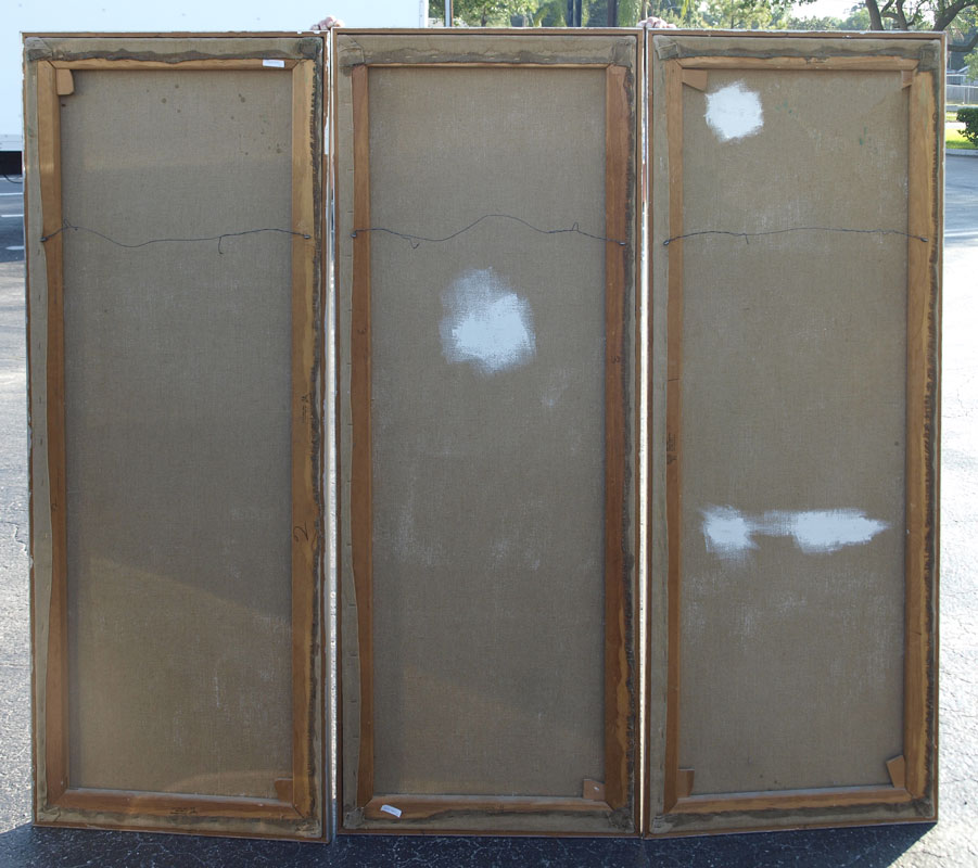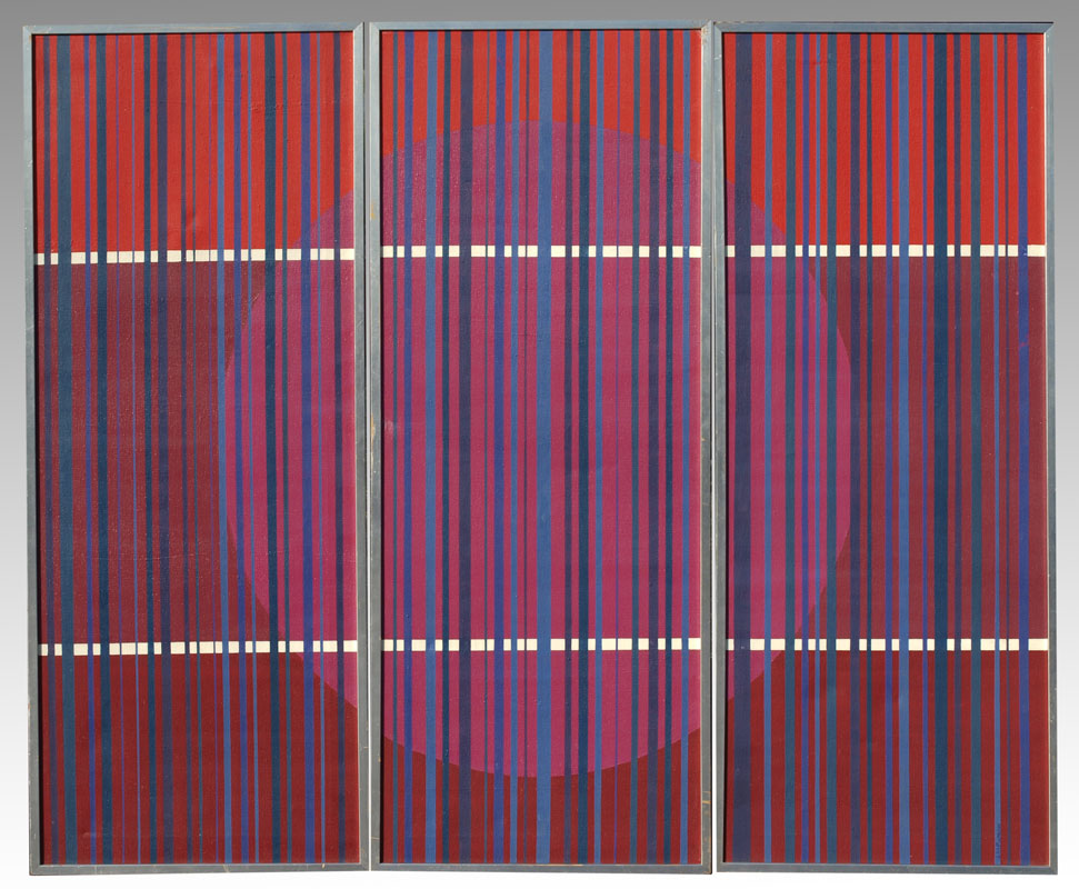 ROMANO, Salvatore Michael, (American, 1925-): Geometric Line and Sphere Composition, Triptych Oil/Canvas Panels, each measure 62'' x 24'', far right panel signed lower right, framed, matching silver gilt frames with wear.