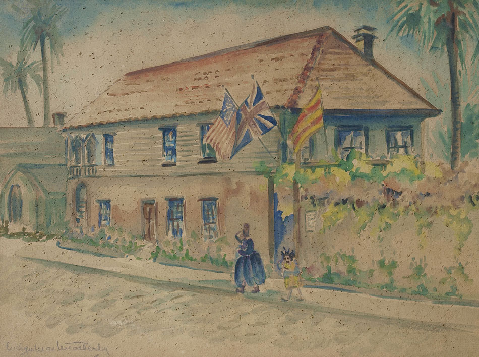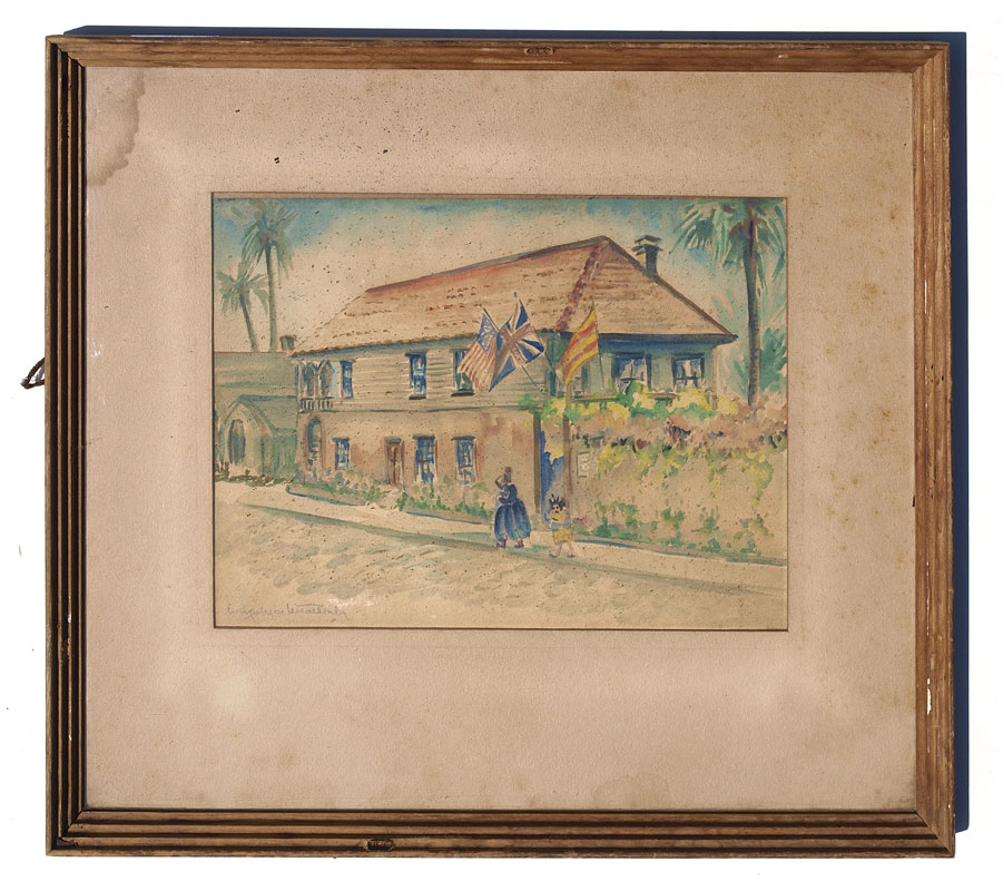 WEATHERBY, Evelyn, (American, 1897-): St. Augustine Street Scene, Watercolor, sight size 8 1/2'' x 11 1/2'', signed in pencil lower left, worn frame 16'' x 18''. Scattered foxing, sold as-is.