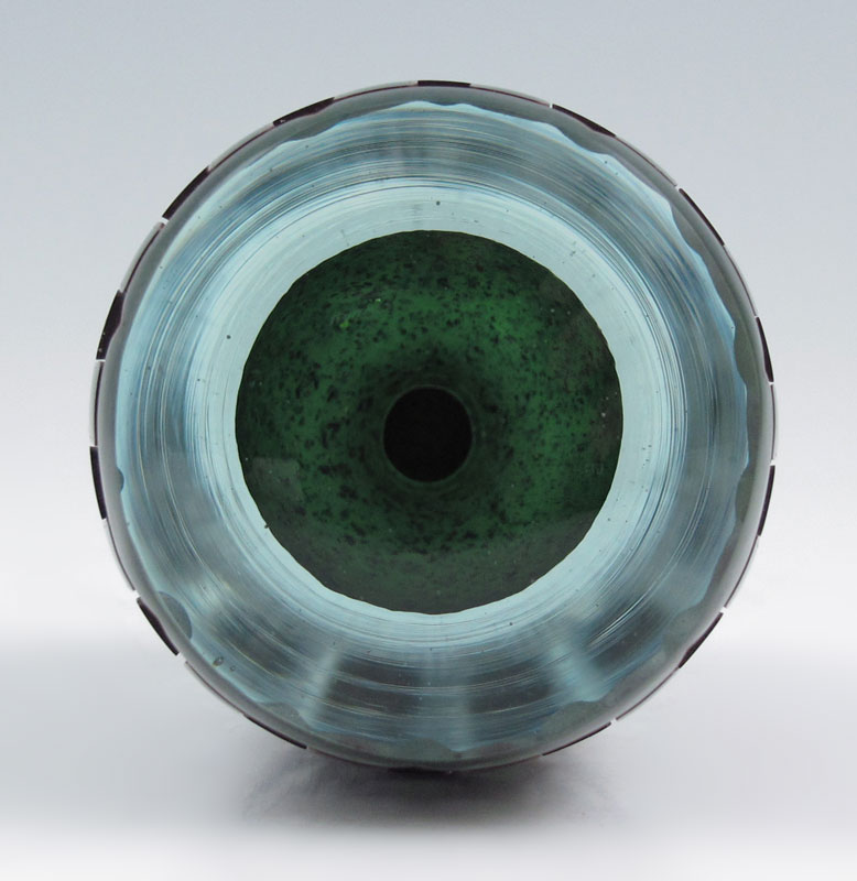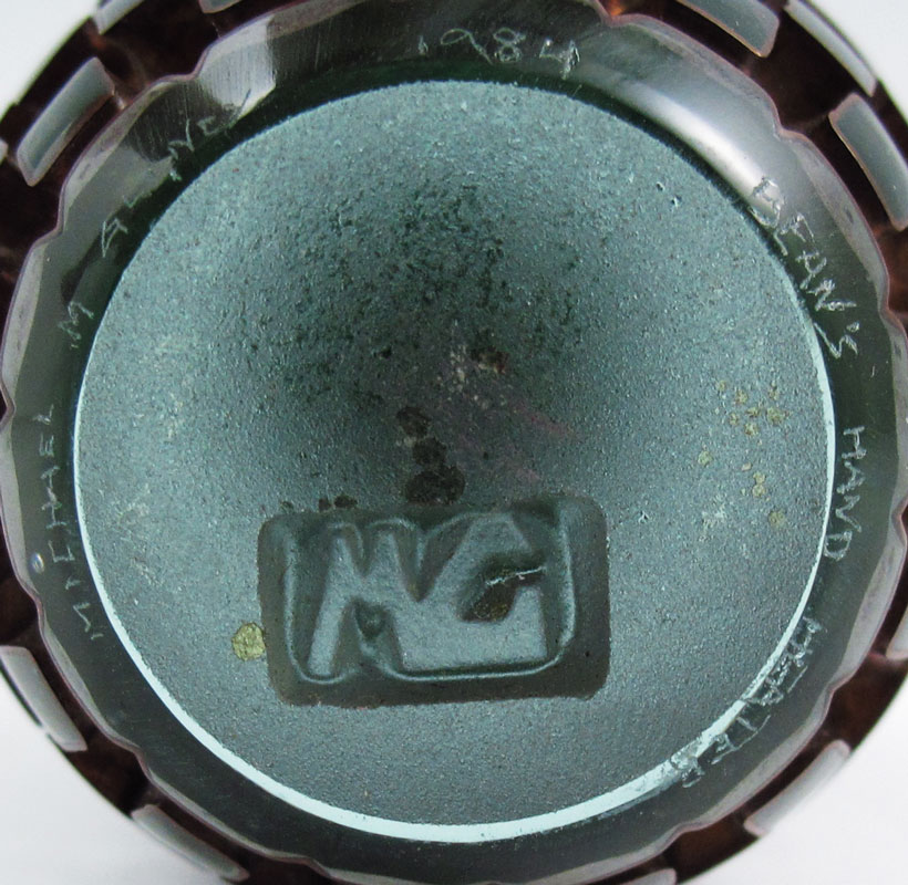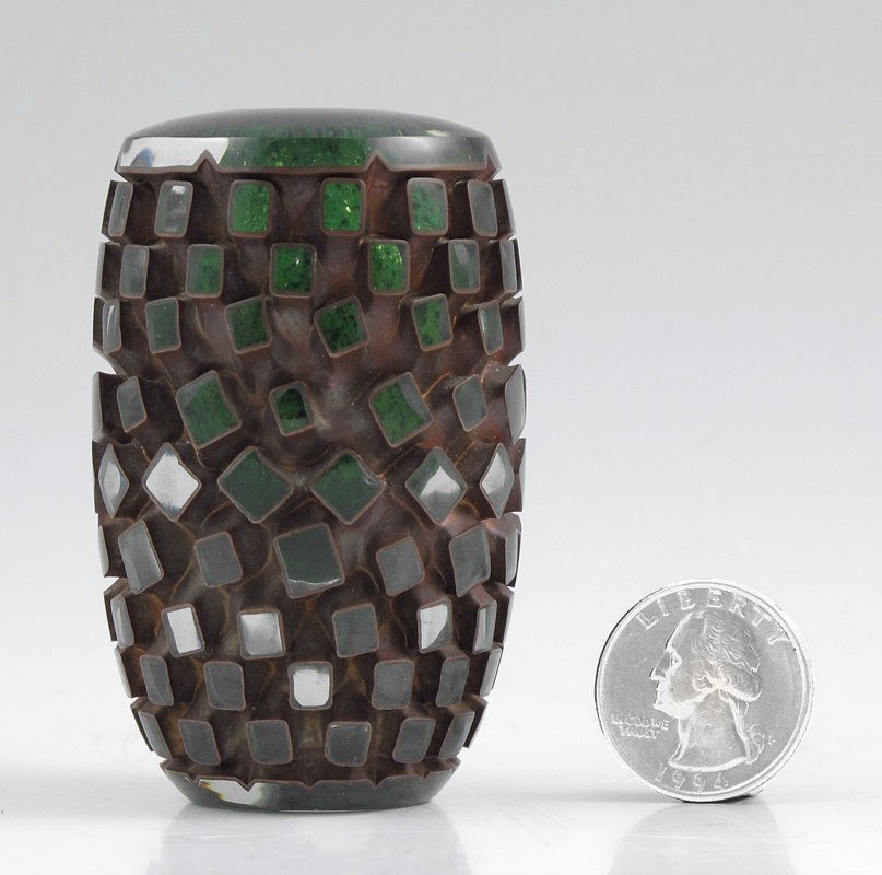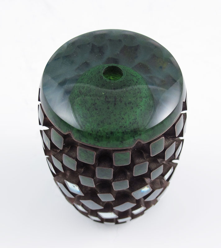 GLANCY, Michael, (American 1950- ): Art Glass ''Beans Hand Heater'', green with copper, signed MG. 3'' tall.