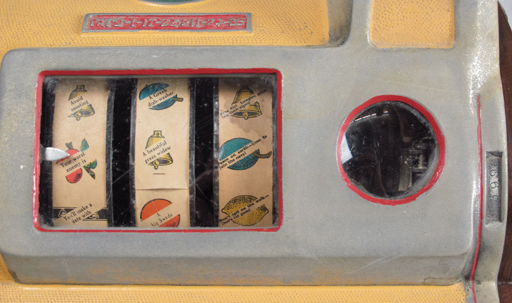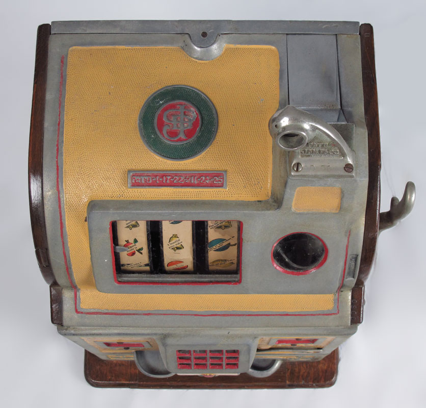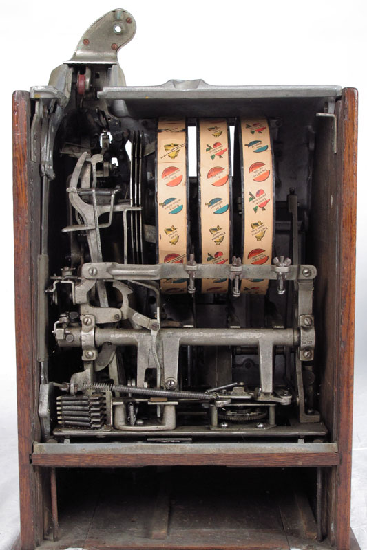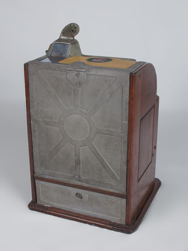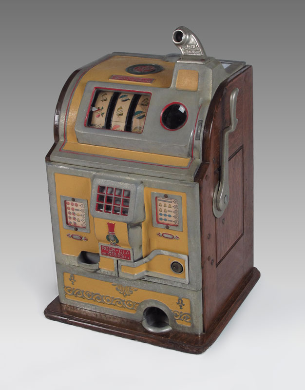 5 CENT ROCK-OLA SLOT MACHINE: Cast iron body with original paint with wood sides and base, serial number 63996. Lever pulls and wheels spin when money is inserted, unsure of payout mechanism. Key in office. 24 1/2'' h. x 15'' x 14''.