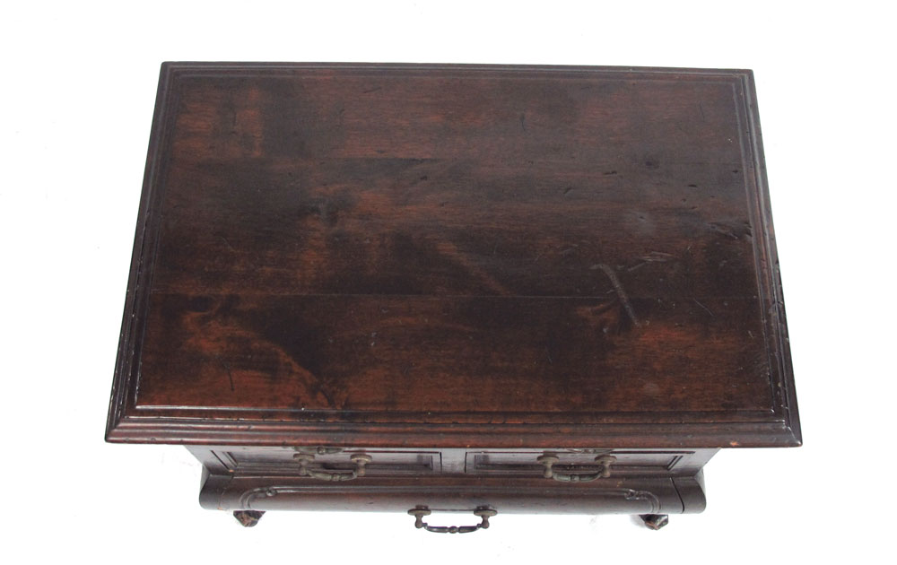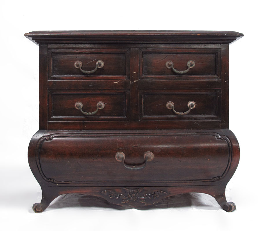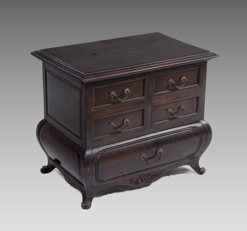 SPANISH MADE B. ALTMAN BOMBE MINIATURE CHEST: 4 upper half drawers over single full length drawer on 4 scroll feet. Marked with metal tag Made in Spain for B. Altman & Co. New York. 16'' h. x 18 1/4'' x 12''.