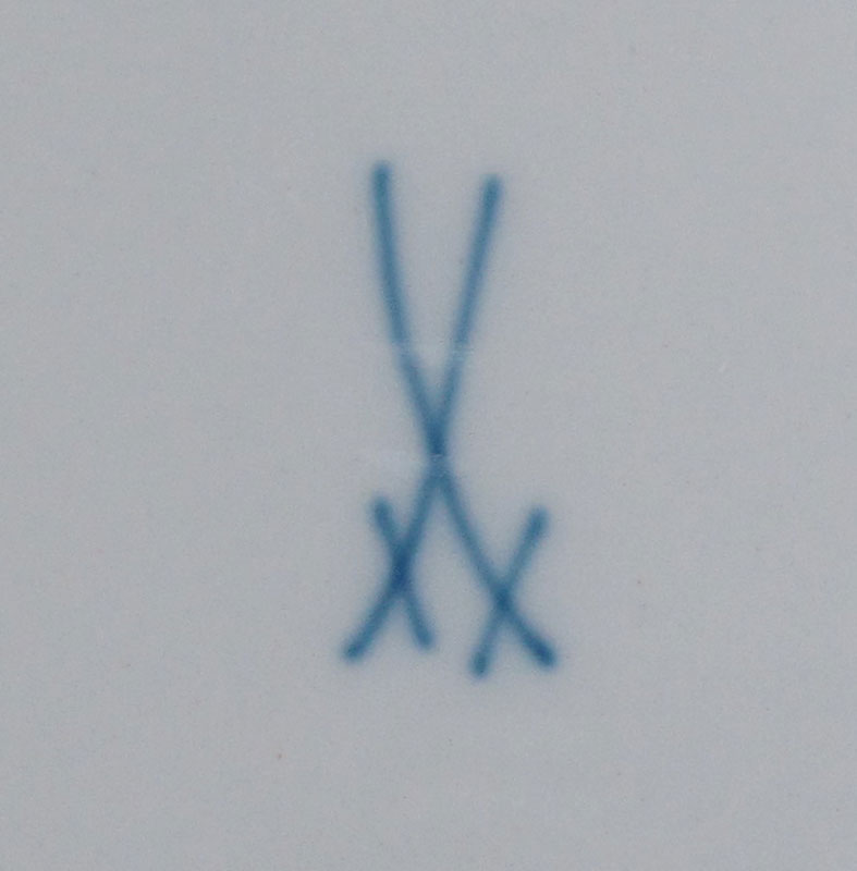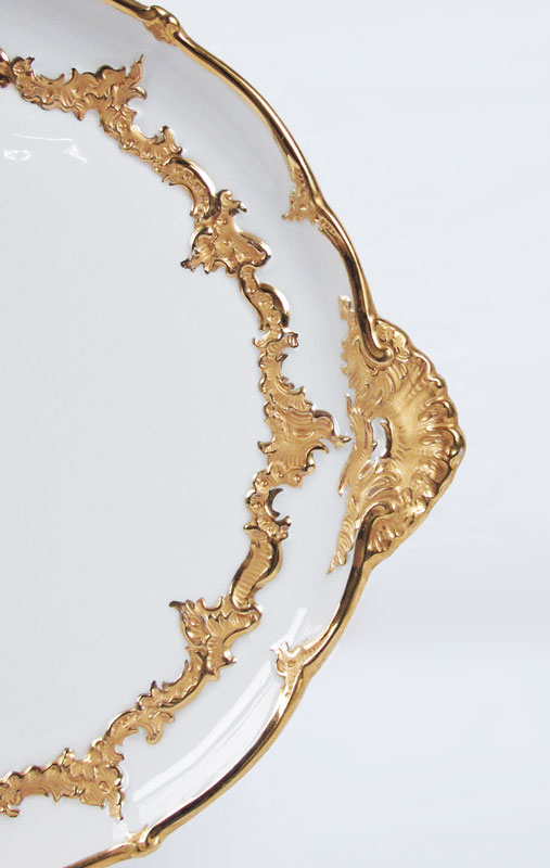 MEISSEN PORCELAIN CABARET SERVICE: Gilt covered design in relief. Includes the tray (18''), coffee pot (10''), hot milk pitcher (minus the lid), cream pitcher, covered sugar, 3 cups and saucers. Cross swords mark under glaze.