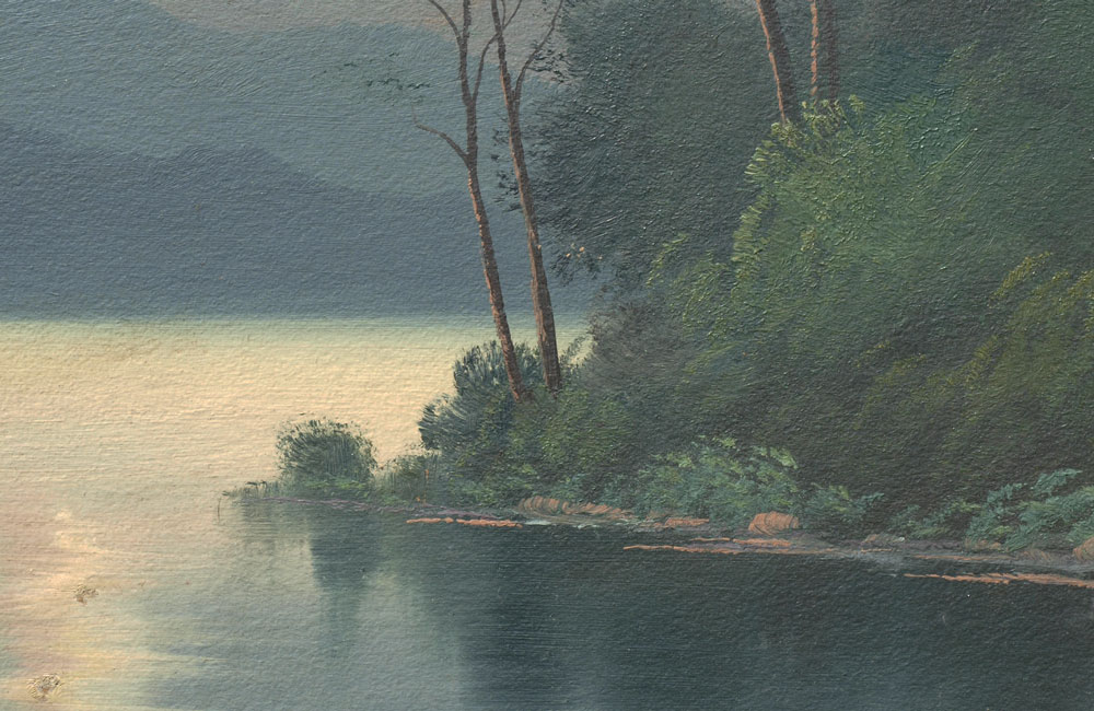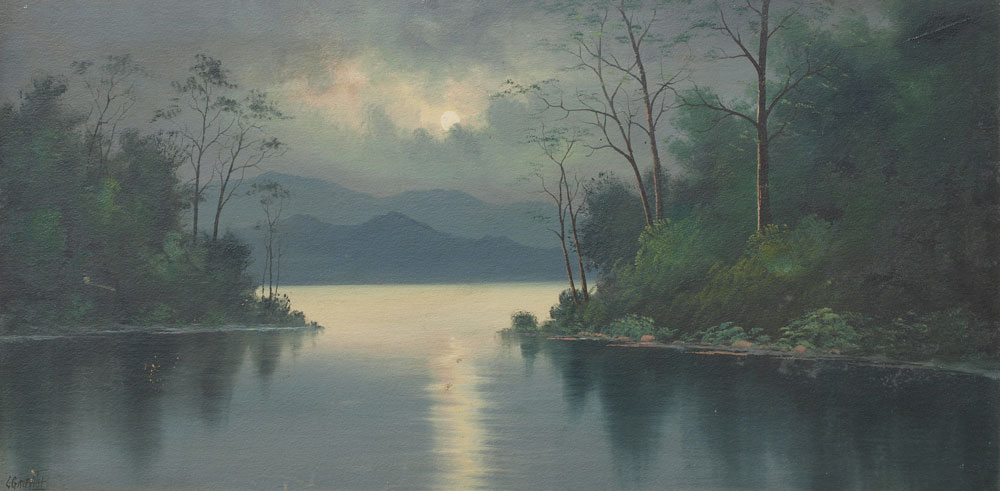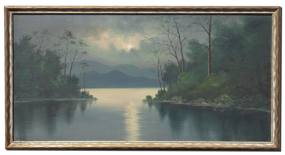 GRIFFITH, Lorenz, (American, 1889-1968): ''Moonlight Lake Lure, N.C.'', Oil/Board, 16'' x 32'', signed lower left, period wooden frame, 18'' x 33 1/2''.