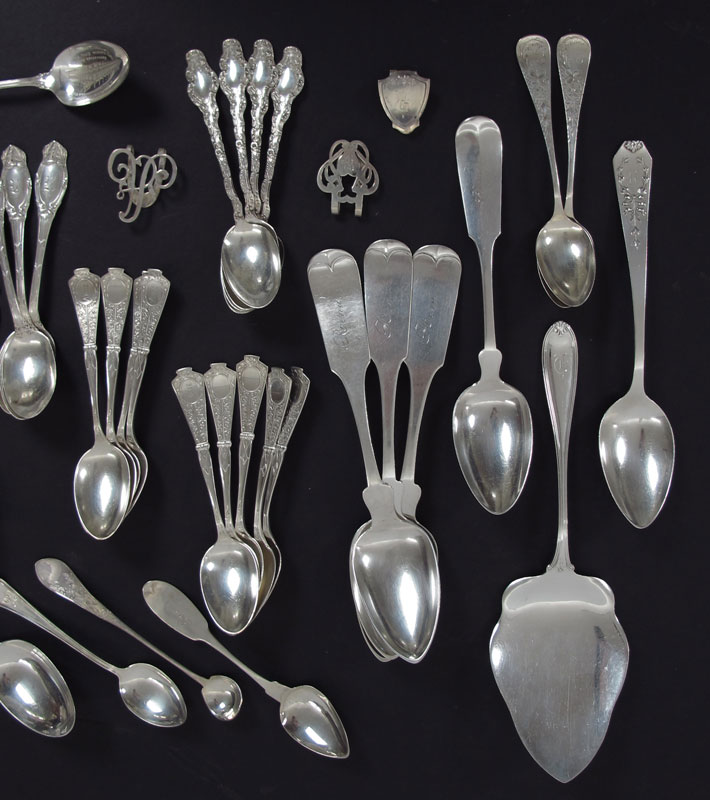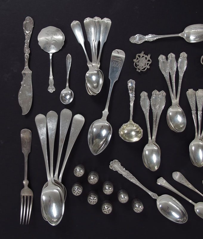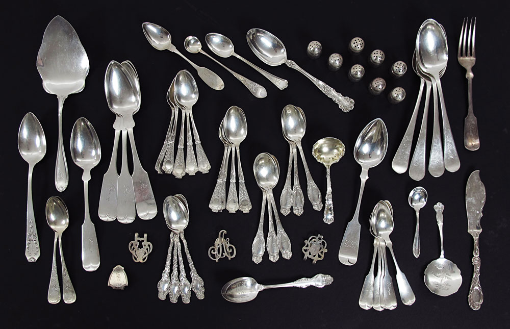 ESTATE COLLECTION OF STERLING FLATWARE: Approx. pieces to include 1) 29 teaspoons in assorted patterns by assorted makers, many are monogrammed. 2) 8 tablespoons in assorted patterns by assorted makers, all monogrammed. 3) International cake server monogrammed, 9 1/2''. 4) Reed & Barton master butter knife 7 3/8''. 5) Paye & Baker small souvenir bon bon server, 5''. 6) Illegible hallmark small ladle, 4 1/2''. 7) International demitasse, monogrammed, 3 3/4''. 8) 4 Assorted place holder clips. 9) 8 SOS Co. salt & pepper. 1 3/8'' h.. Sold with 3 tablespoons, metal content unknown, silverplate fork, silverplate stirrer. Approx. 38.6 troy oz.