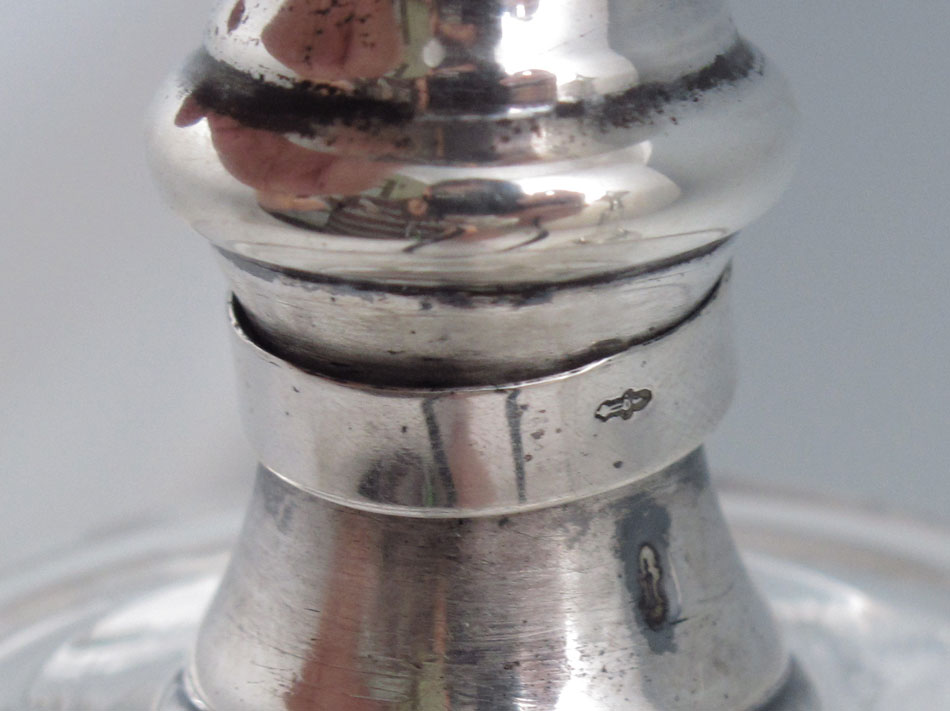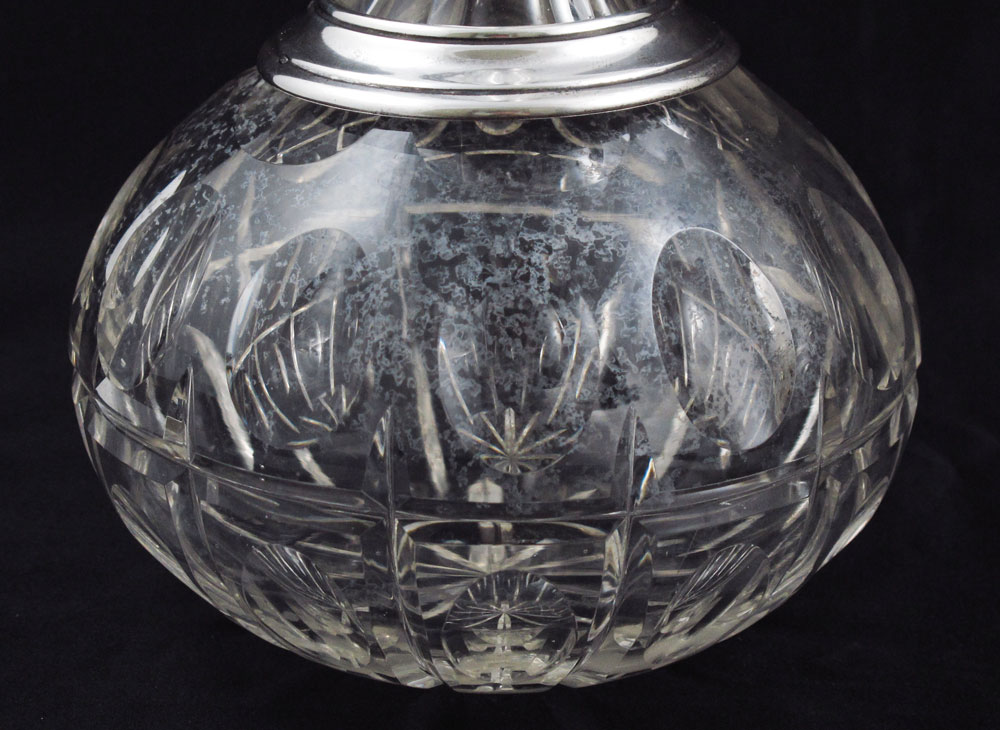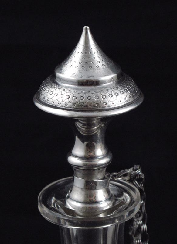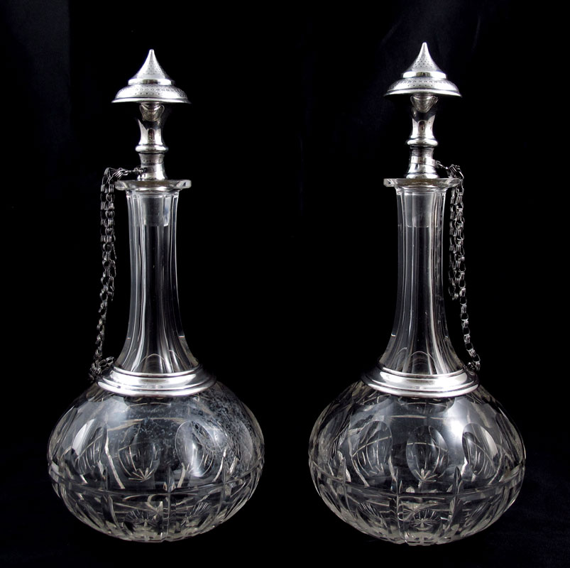 PAIR OF MID EASTERN SILVER MOUNTED BOTTLES: Middle Eastern hallmarked, most likely Iran, silver mounted stopper and collar attached by chain. Unmarked cut glass bodies. 11 3/8'' h. x 5'' dia.