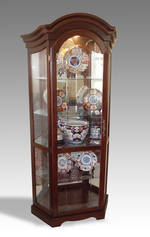 CONTEMPORARY ARCHED TOP CURIO DISPLAY CABINET: Made in USA. Illuminated interior, glass shelves, mirror back. Approx. 78'' tall x 33 1/2'' x 13''.