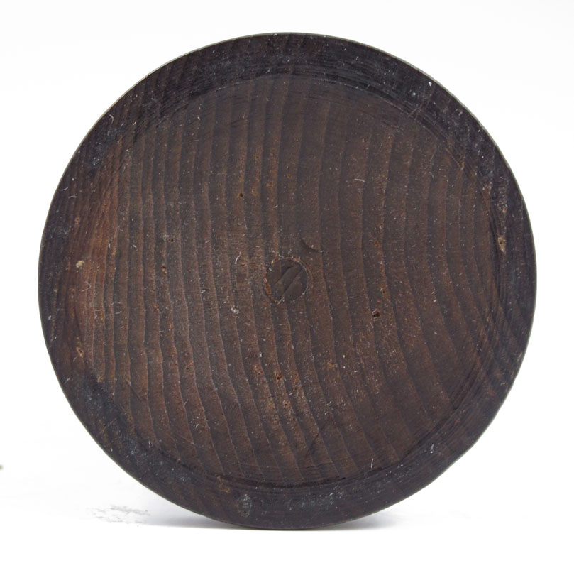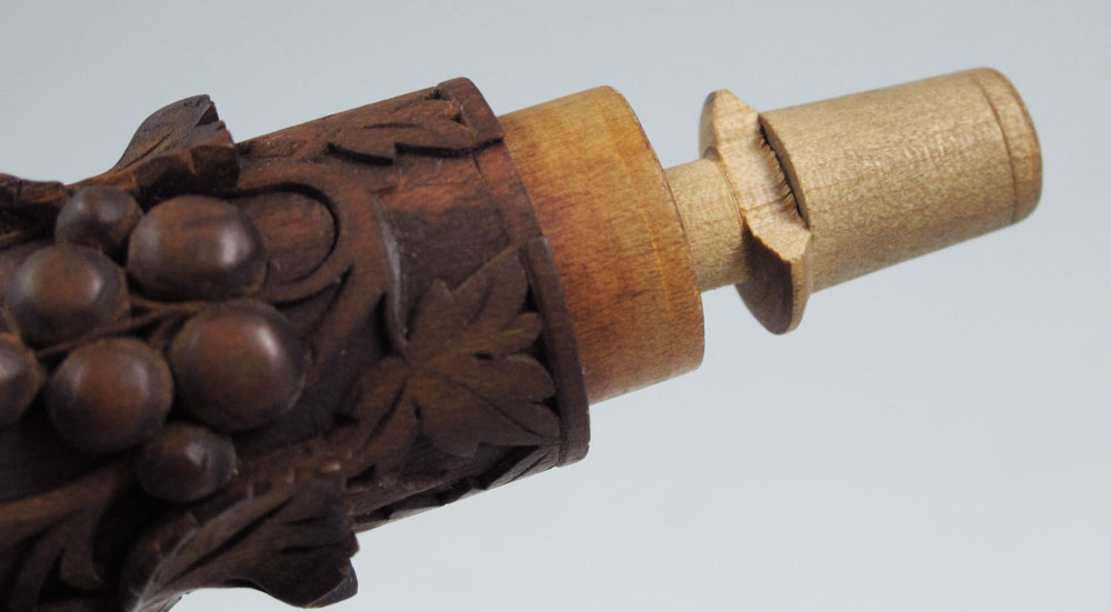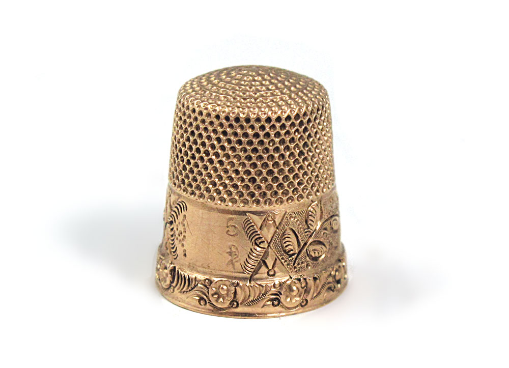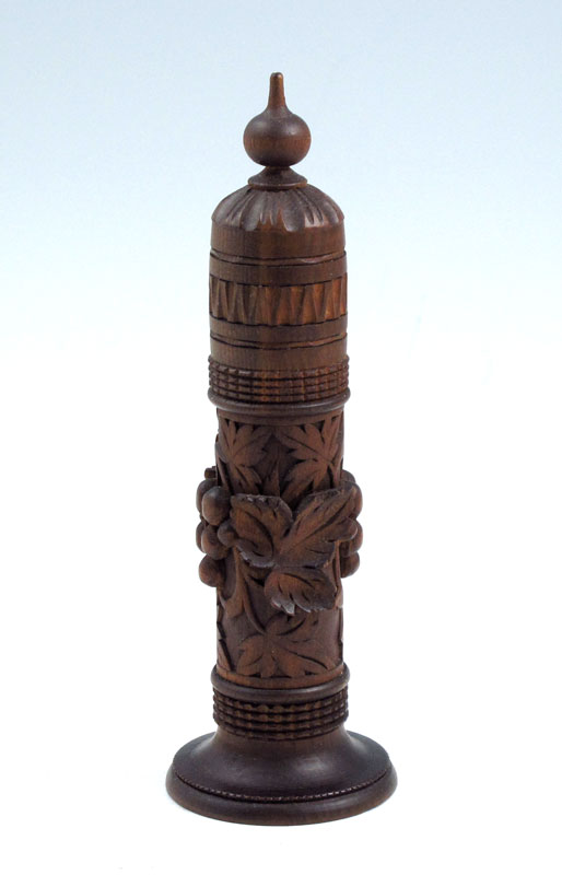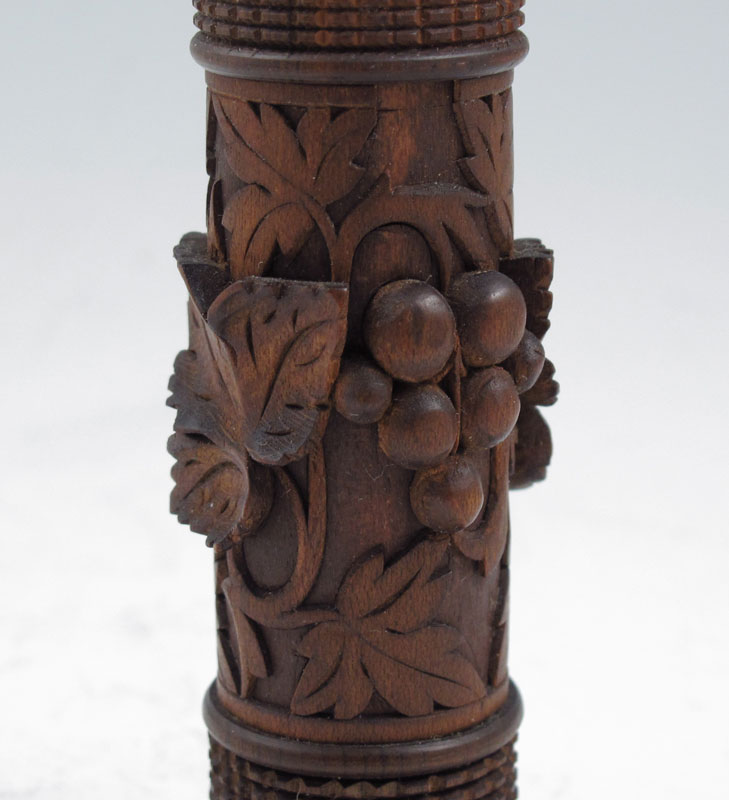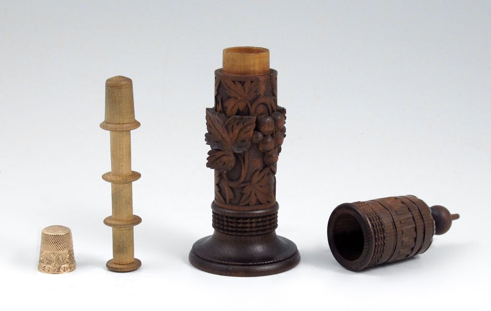 CARVED VICTORIAN ETUI CASE WITH GOLD THIMBLE: Carved etui case with grape vine motif. Removable top opens to reveal #5 14k gold thimble and wood string holder. 5 1/4: h. x 1 3/4''. Approx. 3.1 grams 14k. gold.
