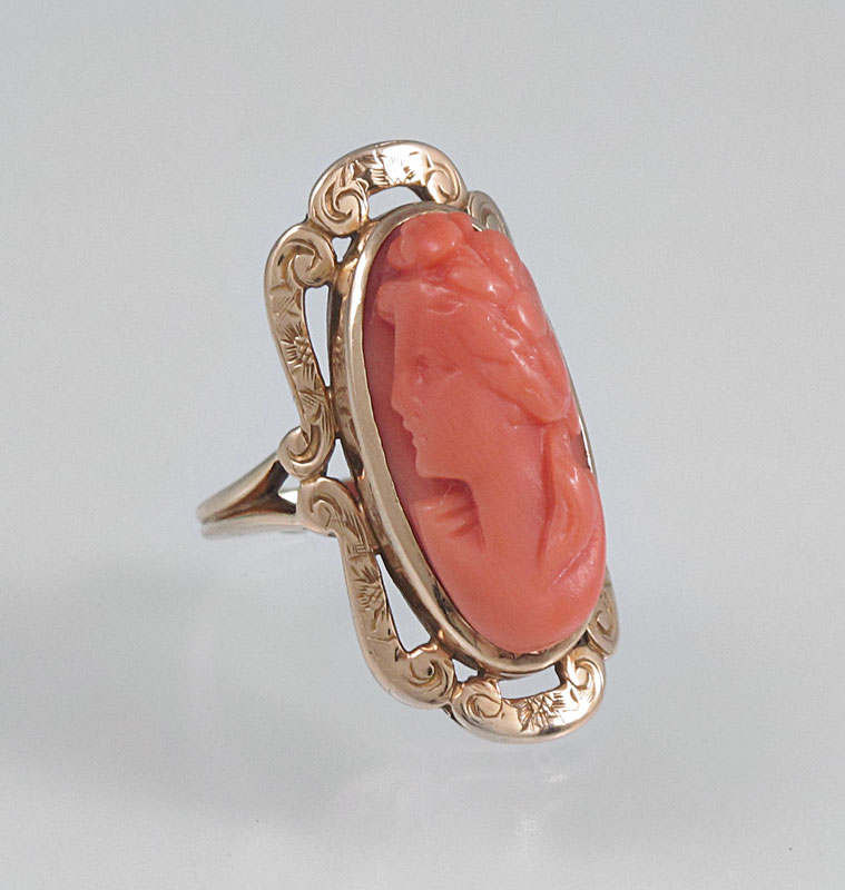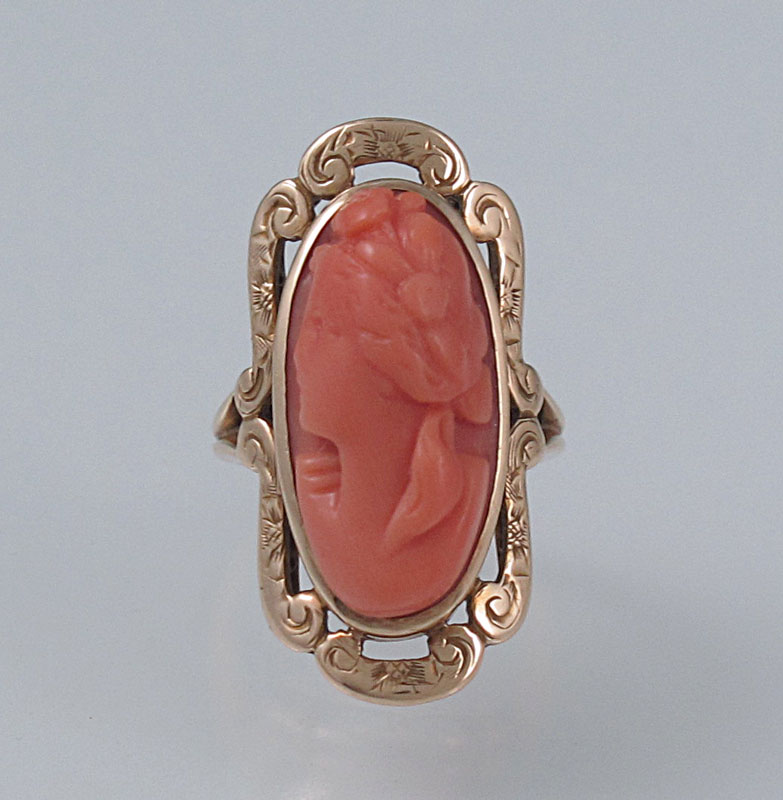 CARVED CORAL CAMEO RING: 14K yellow gold ring with oval coral cameo depicting a Victorian female. The cameo is bezel set. Weight: 6.5 grams. Size: 4.5