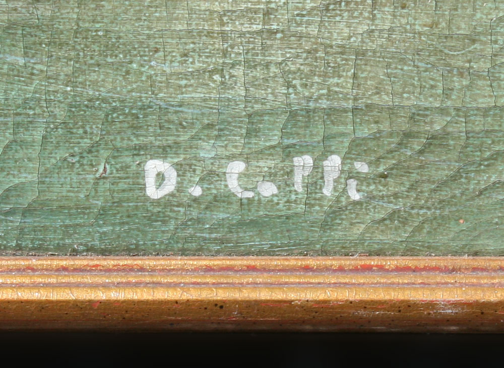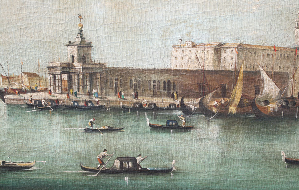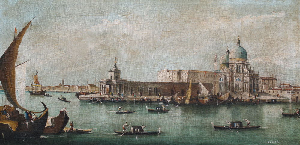 ITALIANATE VENETIAN CANAL SCENE IN THE STYLE OF GUARDI: 24'' x 48'', signed lower right D. Coppi?, worn, gilded frame, 25 1/2'' x 49 1/2''.