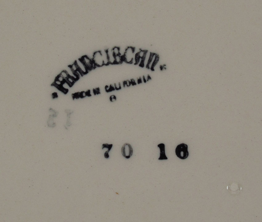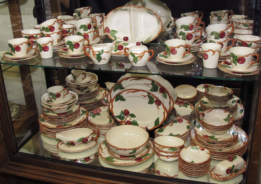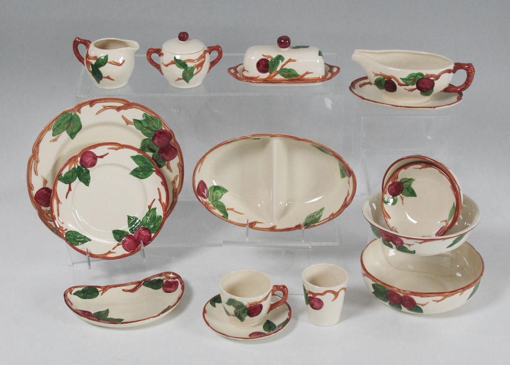 FRANCISCAN ''APPLE'' CHINA: California backstamp. Approx. 109 pieces to include 12 dinner plates, 12 salad plates, 12 crescent salad plates, 11 bread plates, 13 cups, 12 saucers, 12 dessert bowls, 10 sherberts, 3 oatmeal bowls, and 3 juice tumblers. Serving pieces are the 2 platters, divided vegetable bowl, salad bowl, 2 vegetable bowls, 2 covered butters, creamer, sugar, and gravy.