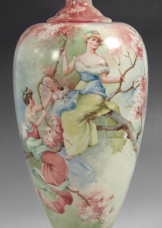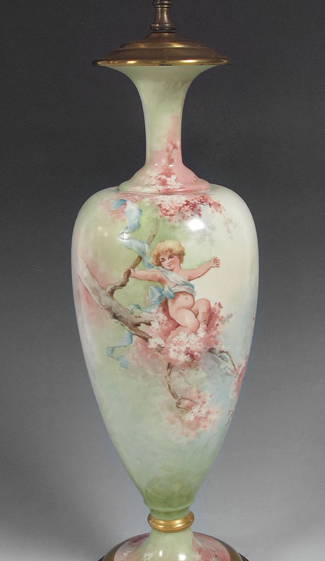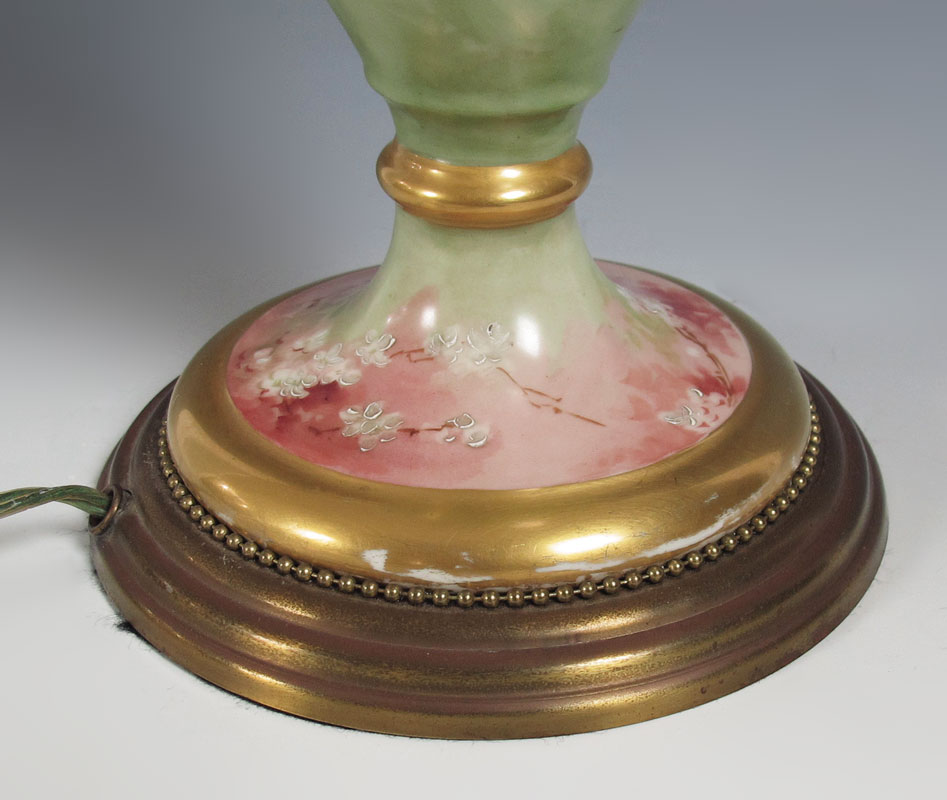 AMERICAN BELLEEK PORCELAIN LAMP: Attribution to American Belleek. Hand painted scene of beauties in flowering branches. Porcelain 17 1/2'' h. affixed to metal base, overall 31 1/2'' h. x 6 1/2'' base dia.