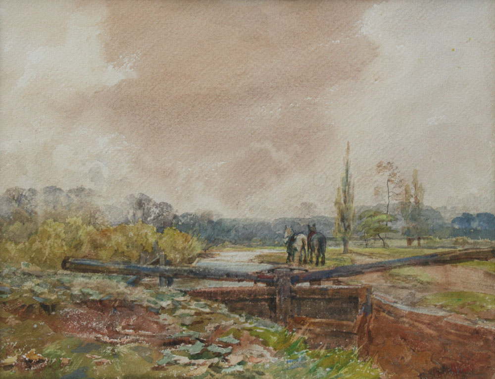 HAYES, Claude, (British, 1852-1922): ''A Loch on the River Stow, Guilford, England'', sight size 11 1/4'' x 14 3/4'', signed lower right, titled verso, gold frame, 20'' x 24''.