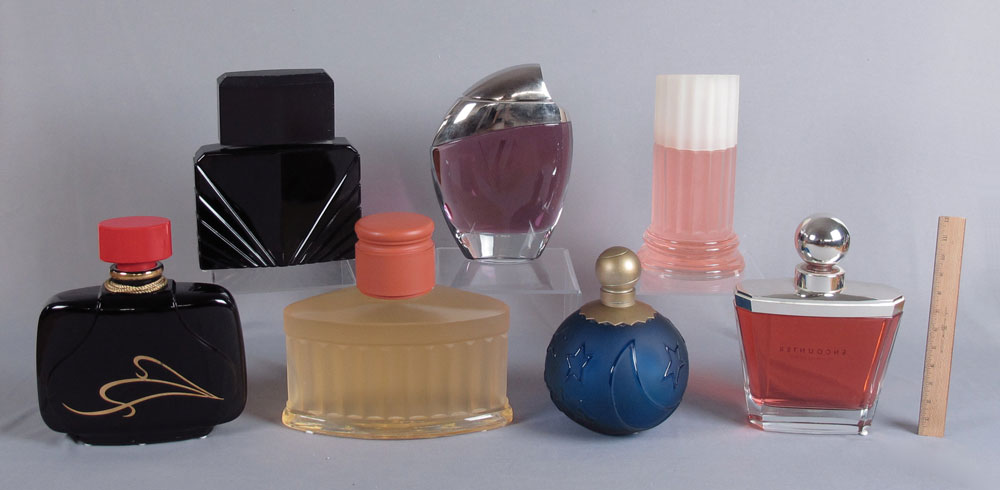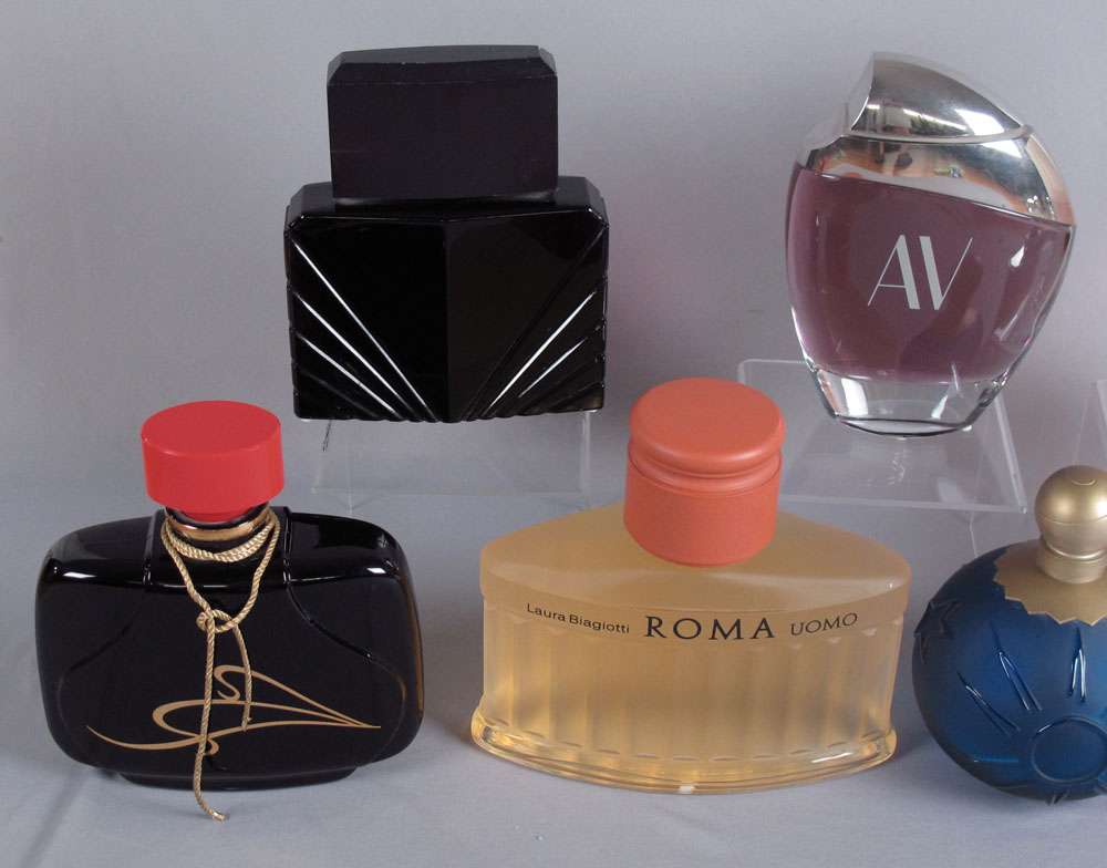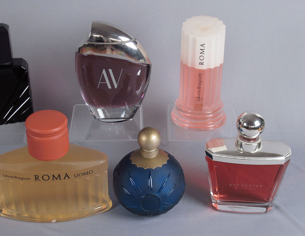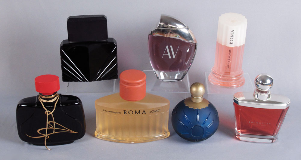 7 PERFUME FACTICE BOTTLES: Roma, Roma Uomo, Moon & Stars, Maxims de Paris, Av, and Encounter. 10'' - 11''h.