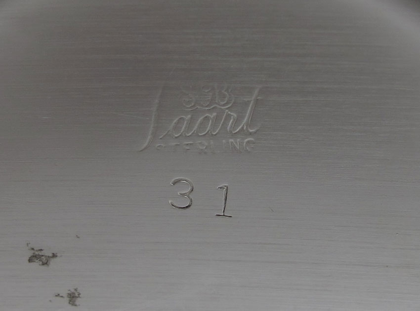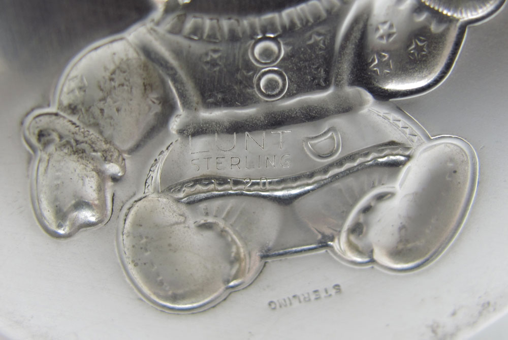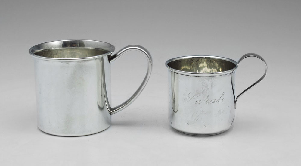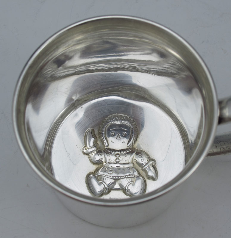 2 STERLING CUPS BABY CUPS: To include 1) Lunt sterling cup with embossed Raggedy Ann in base, 2 1/2'' h. x 3 5/8'' overall. 2) Saart Brothers sterling cup, engraved Sarah, 2 1/4'' h. x 3'' overall. Approx. 4.9 troy oz.