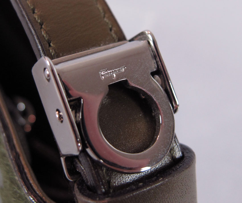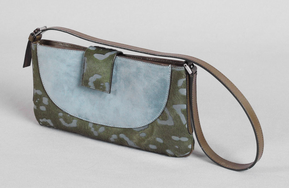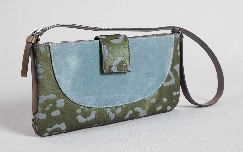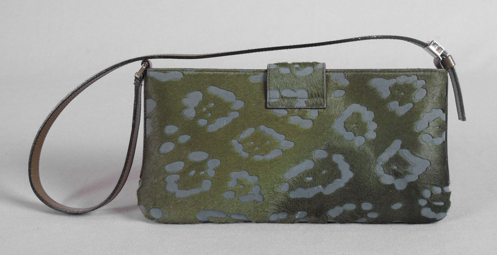 SALVATORE FERRAGAMMO PURSE: Sculpted and dyed pony hide, clutch size with shoulder strap, magnetic closure, approx. 5 1/2''h. x 11''.