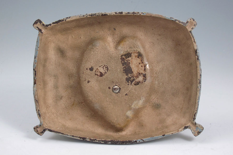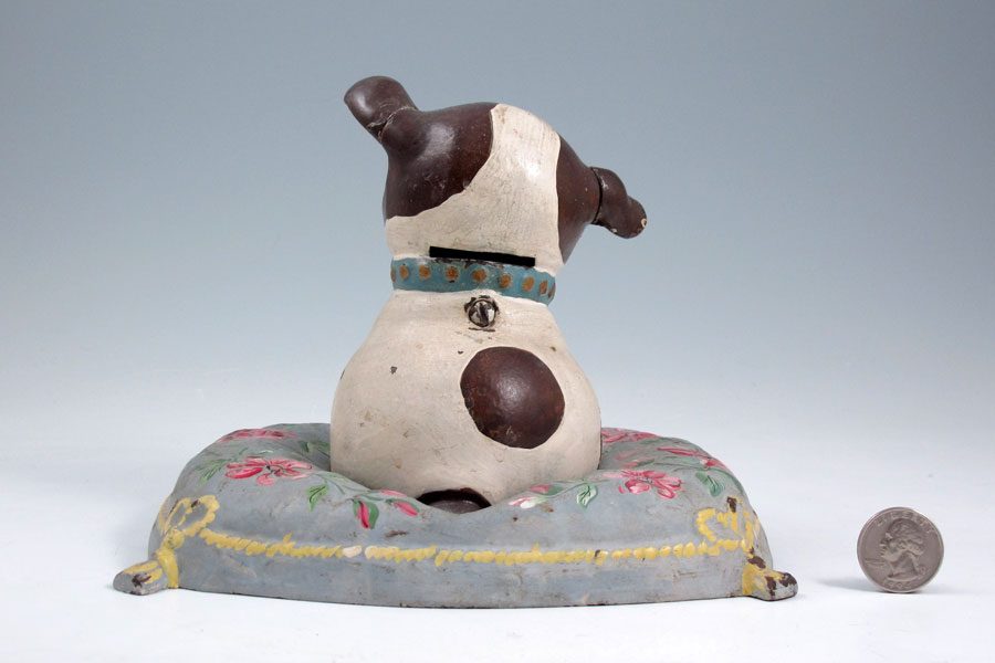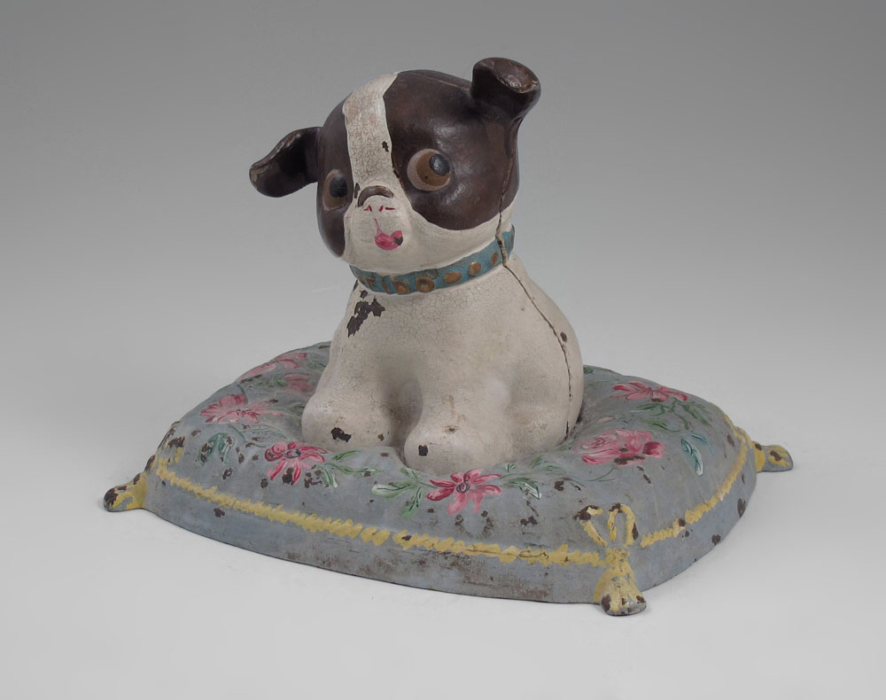 HUBLEY FIDO DOG ON PILLOW DOORSTOP: Whimsical expression on dog's face, seated on a pillow. Turquoise collar marked Fido. Floral decoration on blue / grey pillow. 5 3/4'' h. x 7 1/4'' x 5 1/2'' CONDITION: Note cracklure and flaking of original paint.
