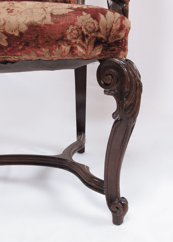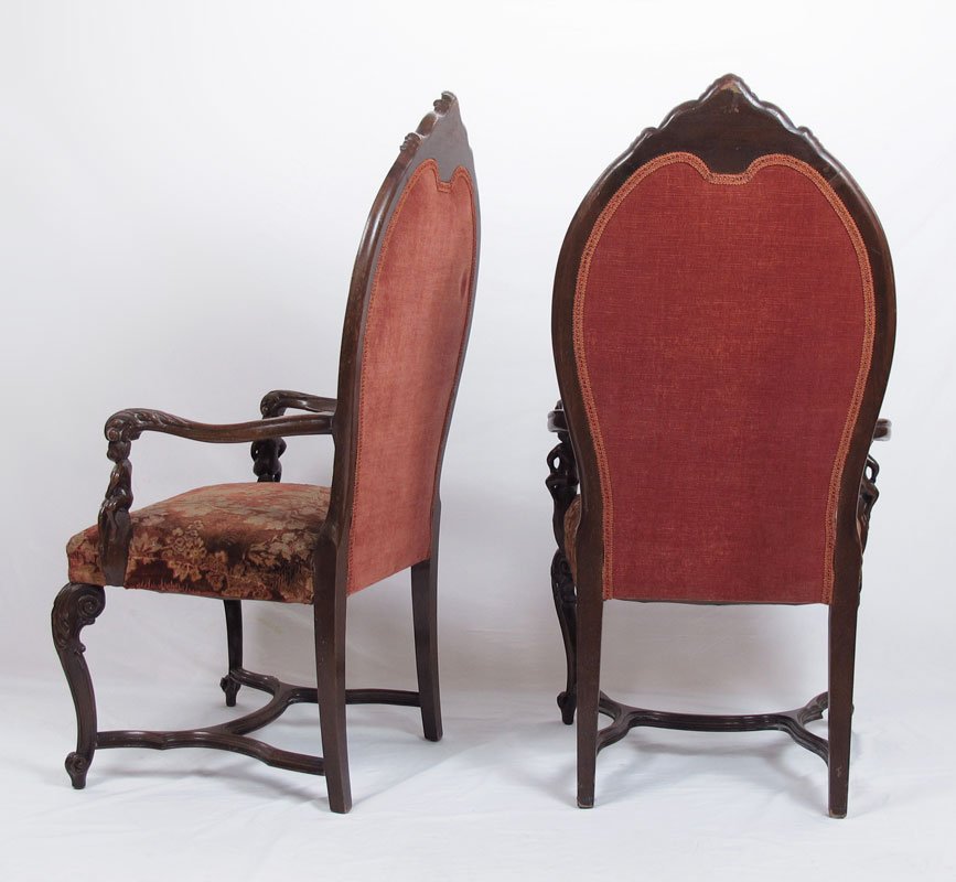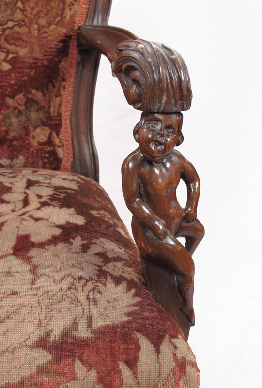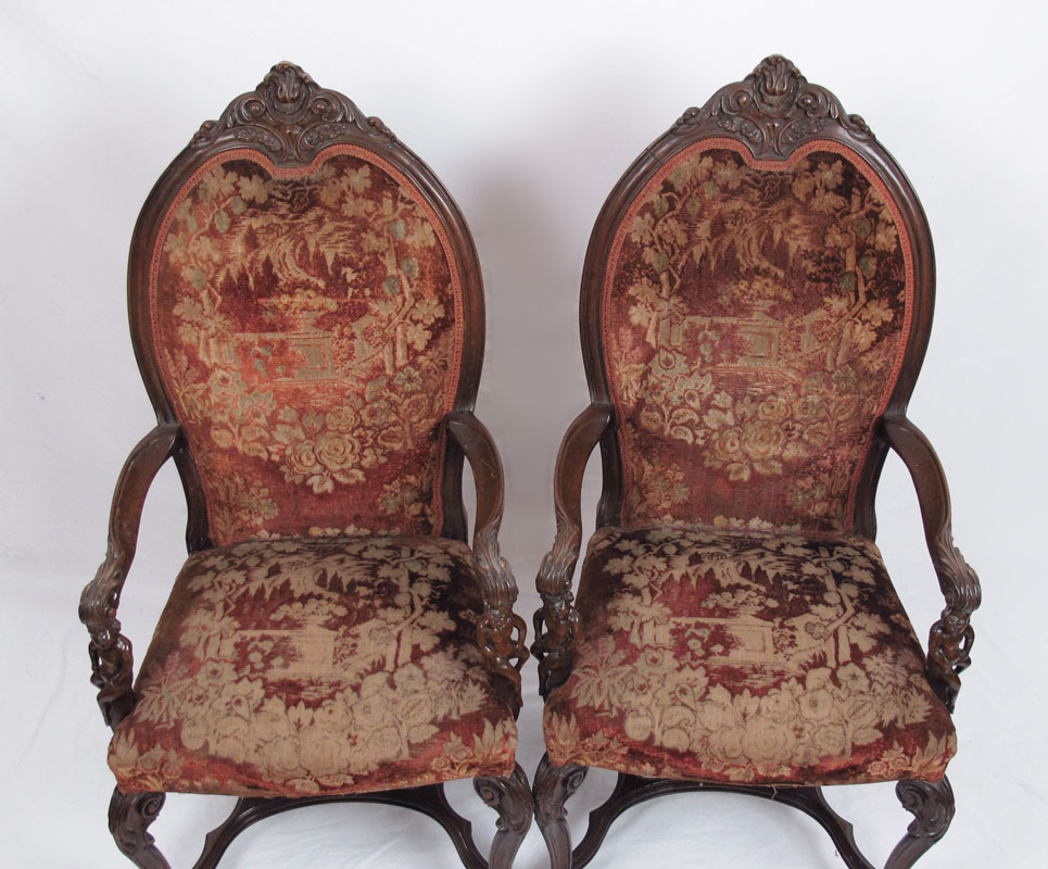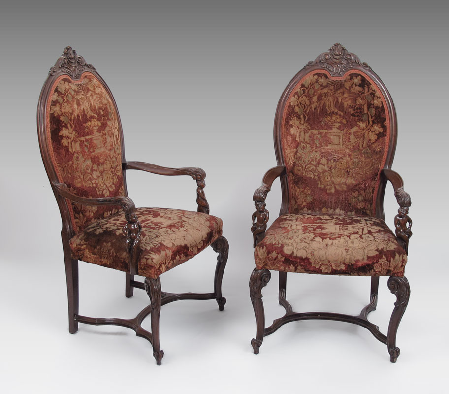 PAIR OF FIGURAL CARVED ARM CHAIRS: Carved and molded open arm chairs with carved full figure arm supports, legs joined by curved stretchers. Appears to be original fabric, comfortably worn. Approx. 50 1/2''h. x 24'' x 19''. Late 19th - early 20th C.