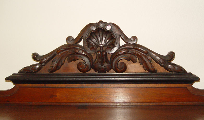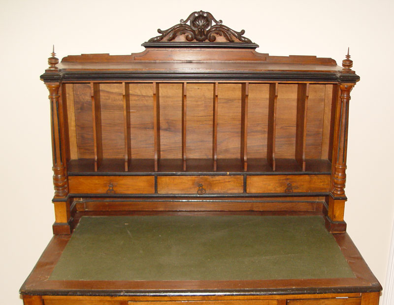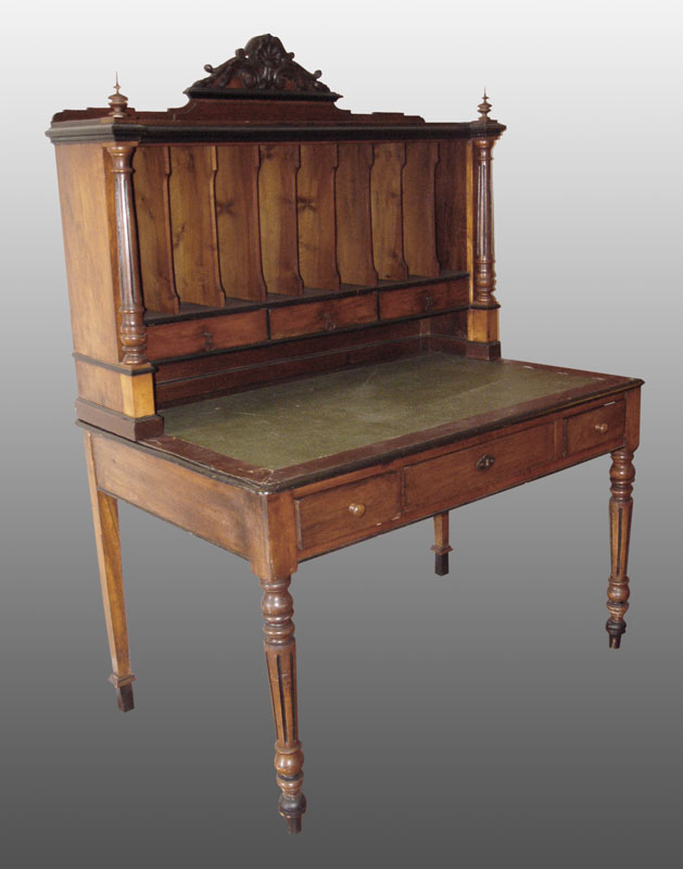 19TH CENTURY PLANTATION DESK: Applied carved shell and foliate scroll crest over cubby holes and 3 drawer top with full column supports and spire finials. All over 3 drawer base with green leather inset top, carved and turned front legs. Painted black accents on trim. 68'' h. x 50 1/2'' x 37 3/4''.