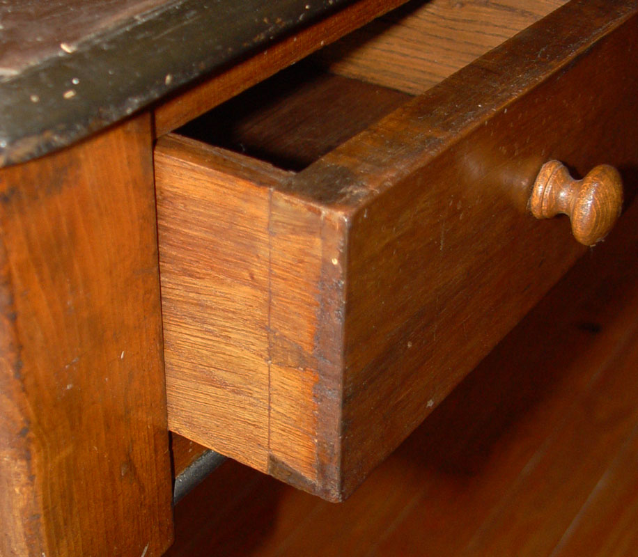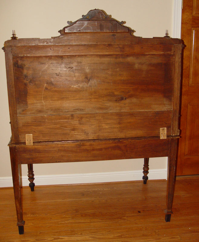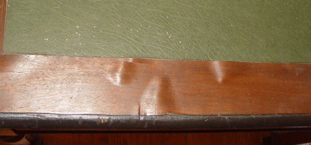 CONDITION: Note delamination around leather inset, this desk saw lots of use and service.