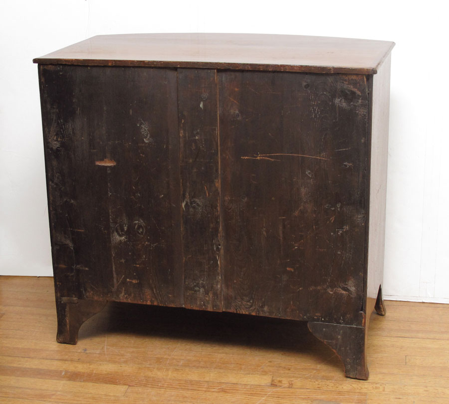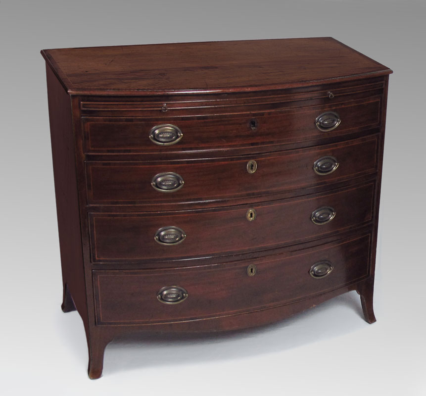 GEORGE III MAHOGANY 4 DRAWER CHEST: Ca. 1830. Swell front banded mahogany chest with dressing slide. Key locking. Later bale type pulls. 34''h. x 37'' x 26''. Mahogany and mixed woods.