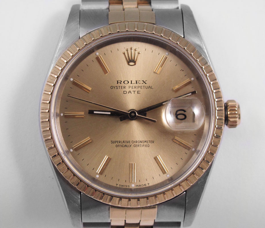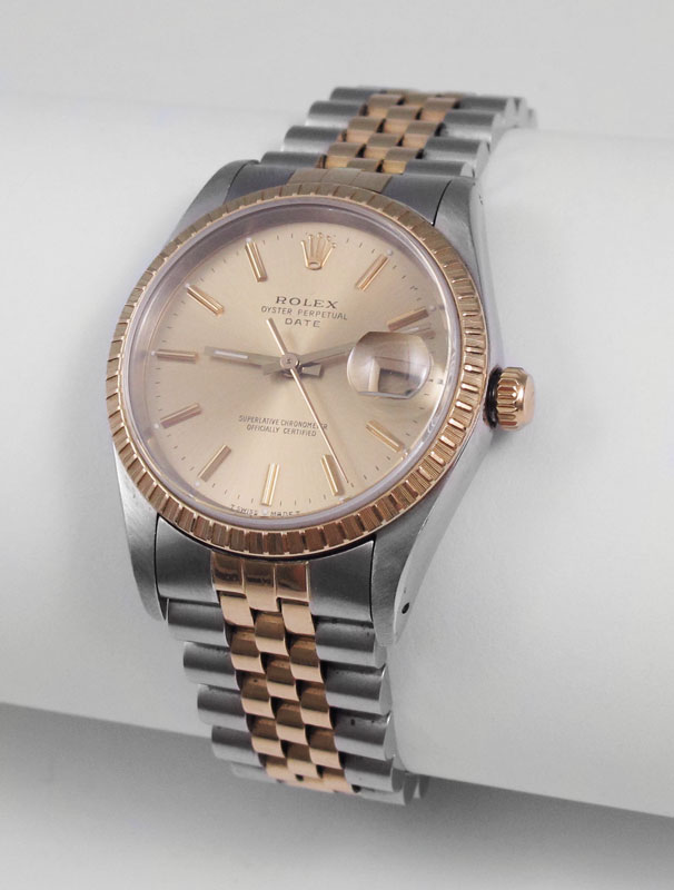 ROLEX OYSTER PERPETUAL WRISTWATCH CA. 1989: 18K gold two tone date model watch with champagne dial, sapphire crystal, Quick Set Date and Chronometer accuracy. Jubilee bracelet band. Good running order. Serial number dates the watch to 1989. All original Sold with the box and Chronometer certificate.