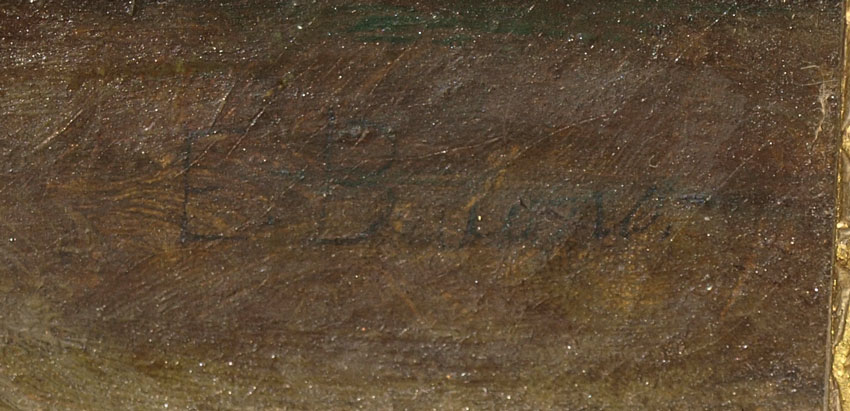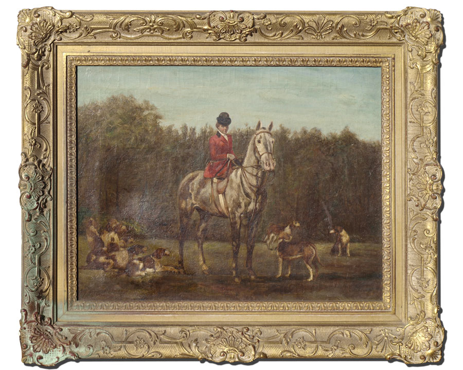 FEMALE FOX HUNT RIDER ON HORSE BACK WITH HOUNDS AT REST IN THE LANDSCAPE SIGNED E. BUONO: Oil/Canvas, 14'' x 18'', signed lower left, gilded gesso frame with over paint and minor wear, 19 1/2'' x 23 1/2''.
