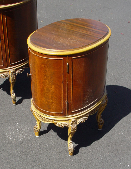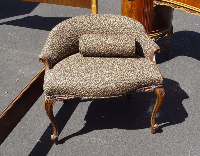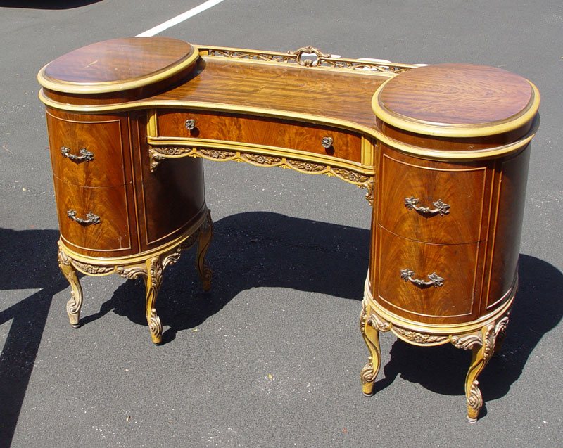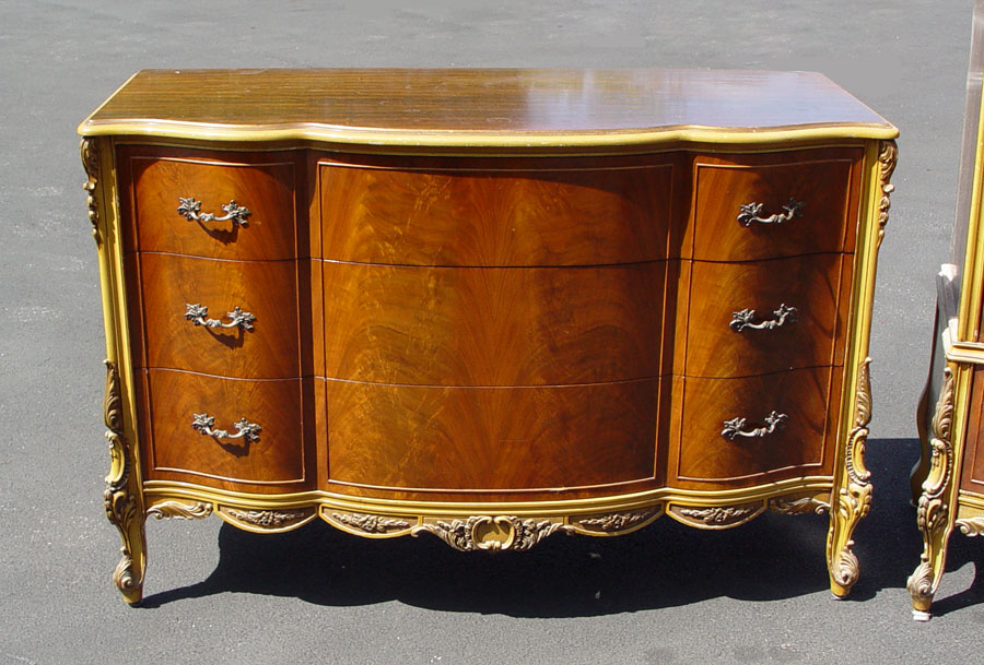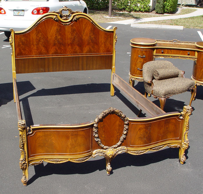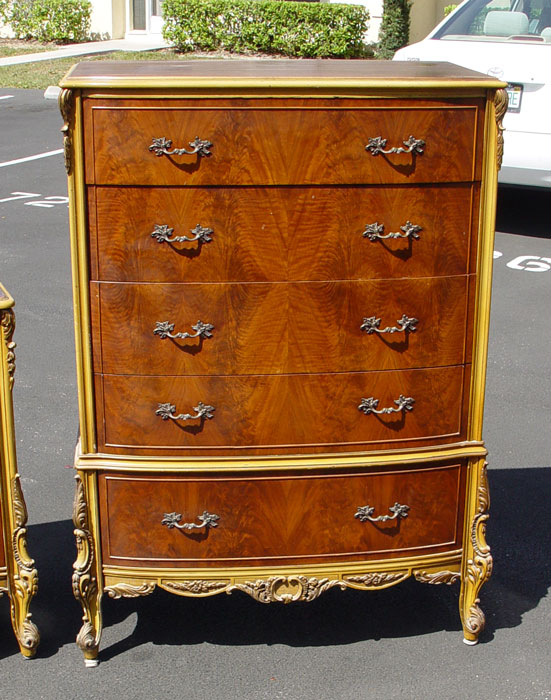 FRENCH STYLE BEDROOM SET BY UNION FURNITURE: Ca. 1920's Burl walnut veneer. To include full size BED headboard 51'' h. x 57'', TALL CHEST 53'' x 37'' x 21'', DRESSER 35'' x 53'' x 24'', VANITY 32'' x 52'' x 21'', 2 MIRRORS one 44'' x 29'', NIGHTSTAND 27'' x 21'' x 15'', and CHAIR 26 1/2'' x 29 1/2'' x 19''.
