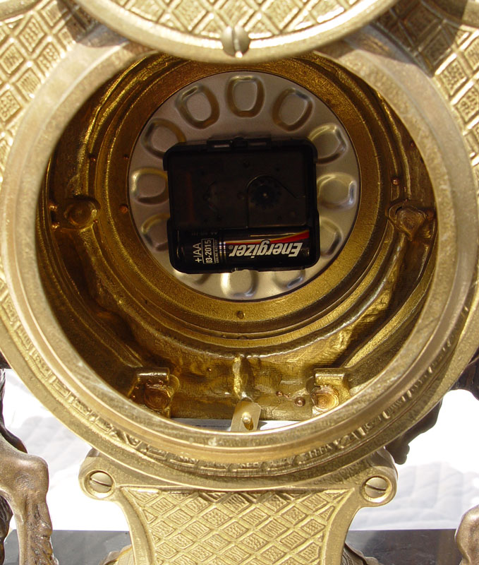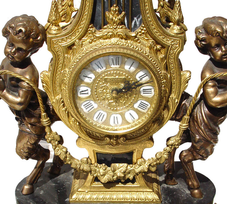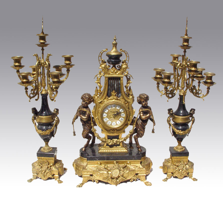 IMPERIAL FIGURAL CLOCK GARNITURE SET: Figural pan children, cast metal body with black variegated marble accents. Battery operated quartz movement. 24'' h. x 14'' x 8''. Sold with pair of matching 7 light candelabra, 27'' h. x 10''.