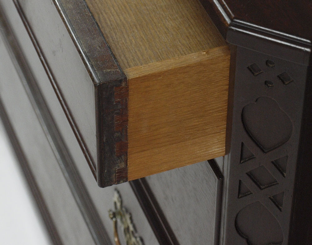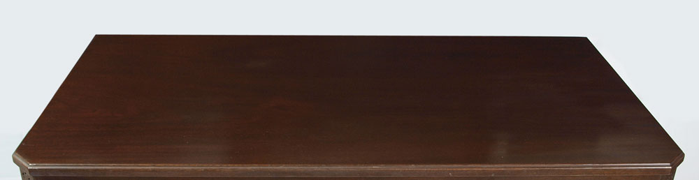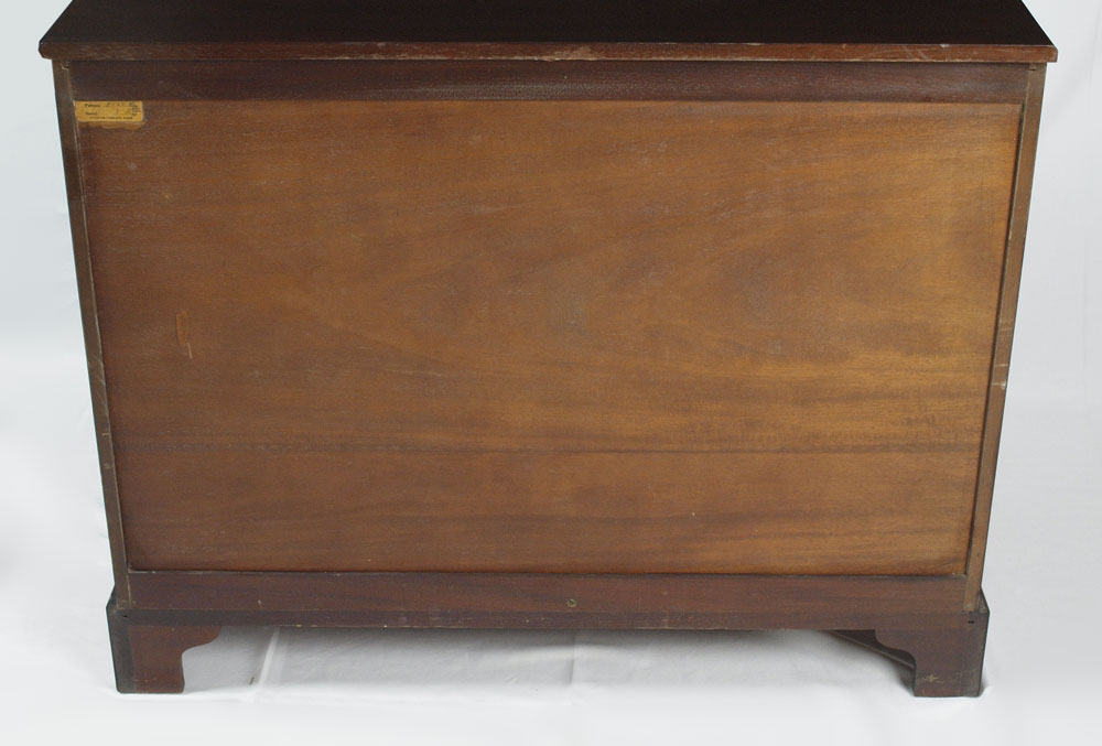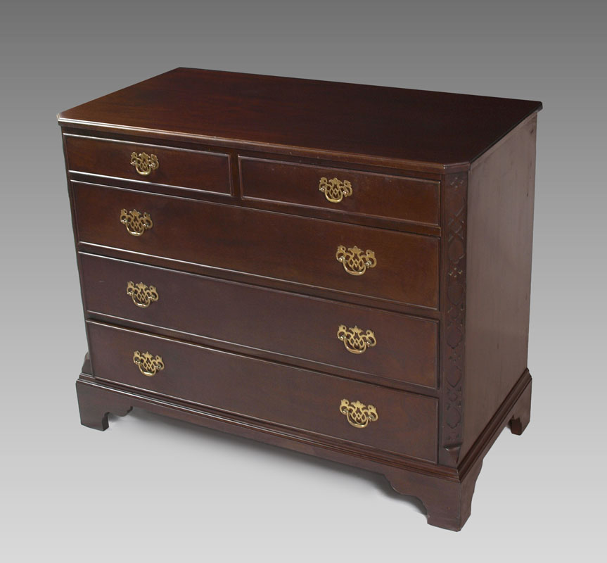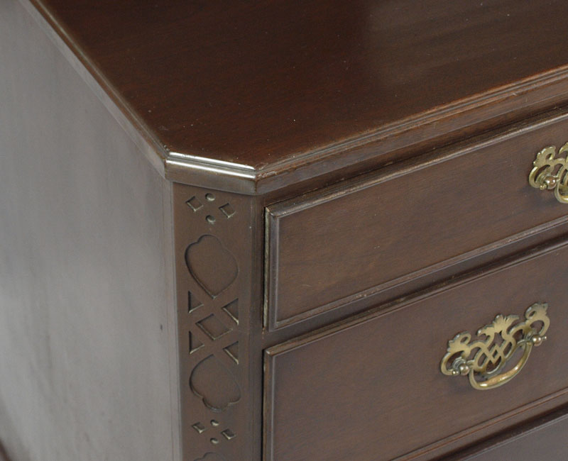 KITTINGER MAHOGANY CHEST OF DRAWERS A560: Chippendale style mahogany chest, 2 drawers over 3 drawers. Relief carved canted corners. 34''h. x 42'' x 21''. Metal Kittinger name plate.
