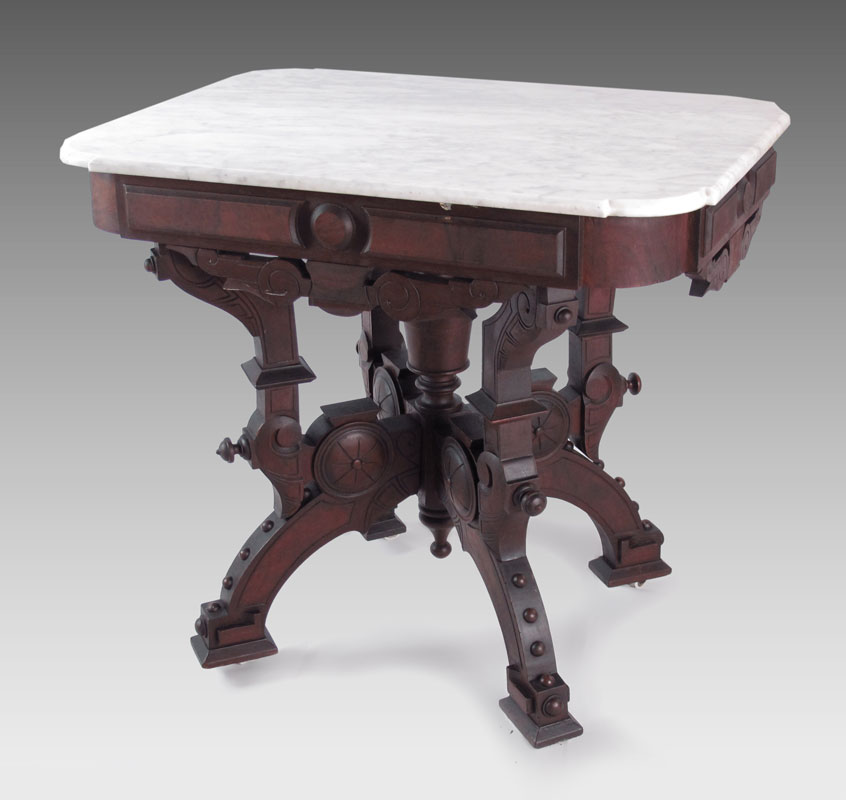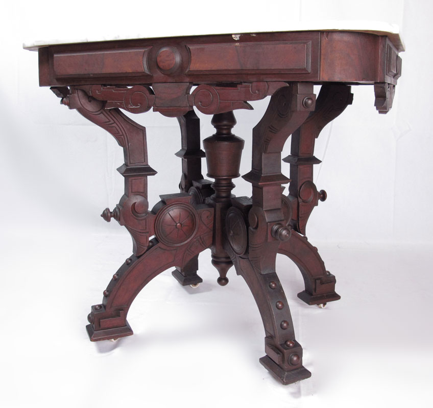 FINE VICTORIAN MARBLE TOP SIDE TABLE: Highly ornate mahogany table with carved and applied decoration, white variegated beveled marble with shaped corners, on castors, 29''h. x 32'' x 23''.
