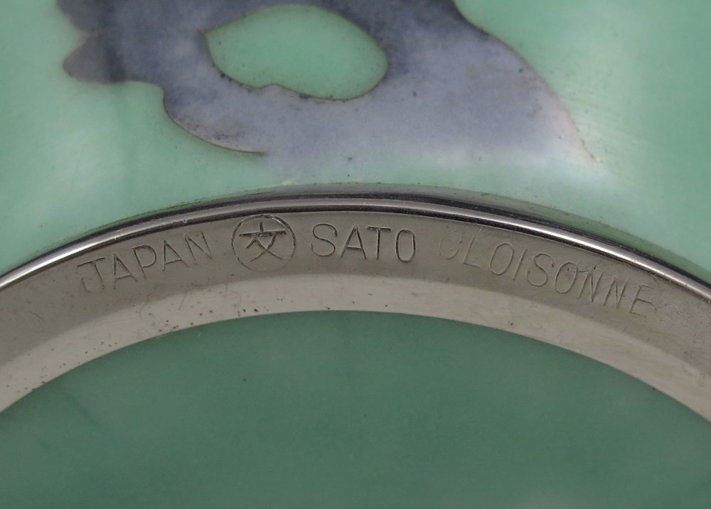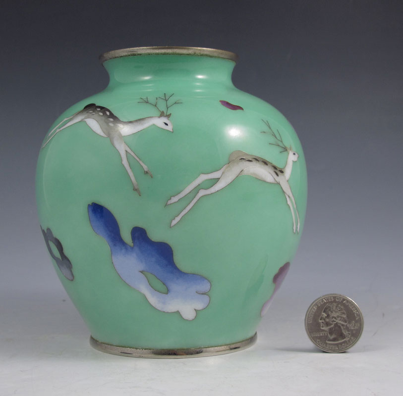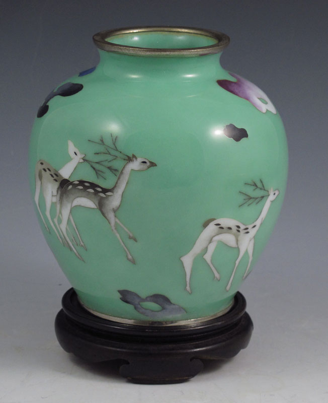 JAPANESE SATO WIRELESS CLOISONNE VASE: Unusual soft green color ground with deer amongst the clouds. Silver metal base ring impressed ''Japan Sato Cloisonne''. 5'' tall.