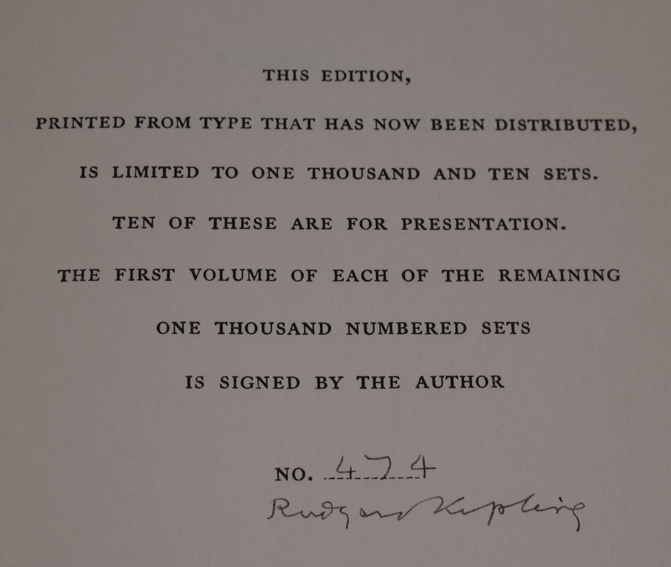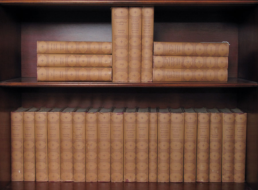 28 VOLUMES BURWASH EDITION COMPLETE WORKS OF RUDYARD KIPLING: Signed by Kipling in Volume I, numbered 424 of 1010. All with original dust jackets, embossed red cloth gilt covers. Full title of series ''The Burwash Edition of the Complete Works in Prose and Verse of Rudyard Kipling''.