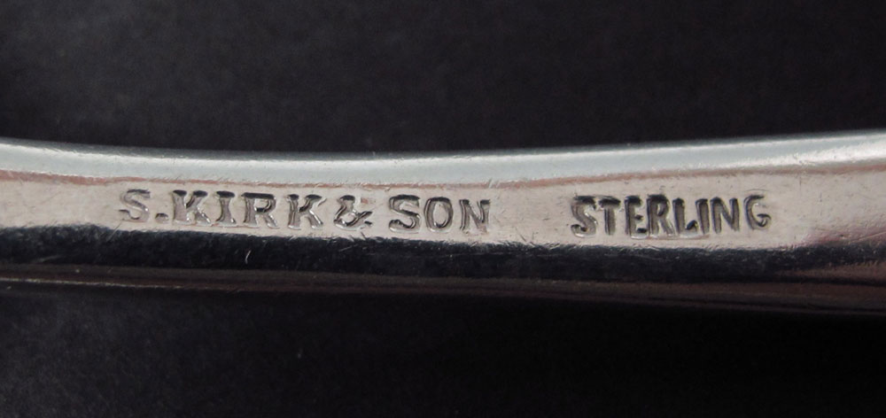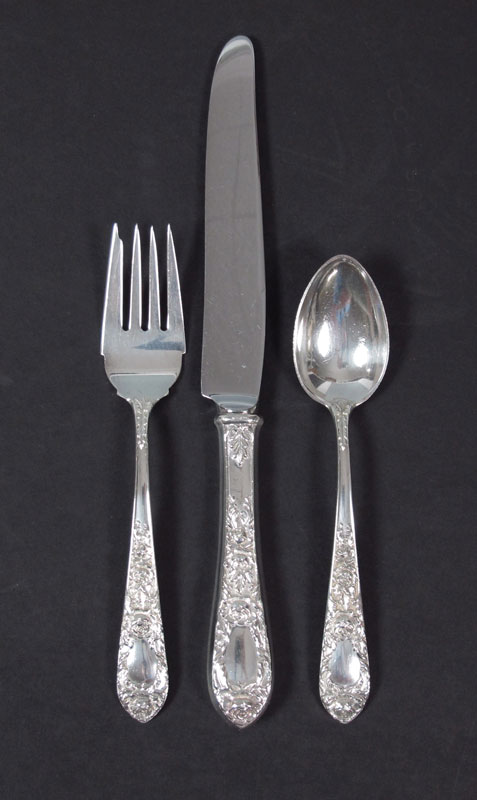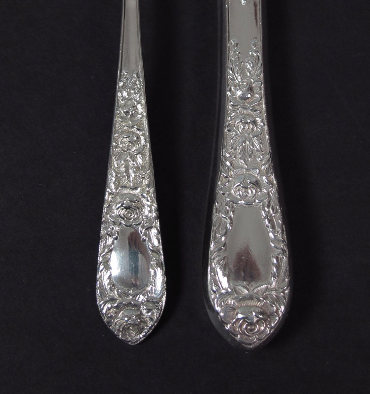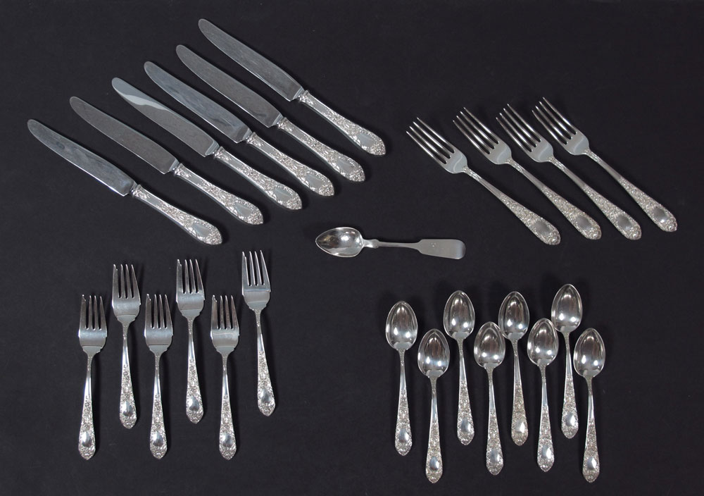 KIRK & SON ROSE STERLING FLATWARE SET: Approx. 24 pieces in the Rose pattern by S. Kirk & Son to include 4 forks (7 3/8''), 6 salad forks (6 1/4''), 8 teaspoons (6''), 6 hollow knives (9''). Sold with coin silver teaspoon (5 3/4''). Approx. 24.4 troy oz.