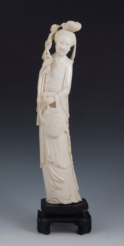 CHINESE CARVED IVORY FIGURE: Beautifully detailed from her hair to her draped gown. Carved from a single tusk, 12 1/4'', the wood stand 3'' x 4'', approx. 14''h. overall.