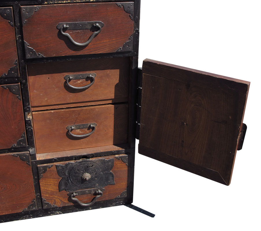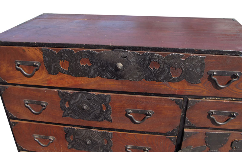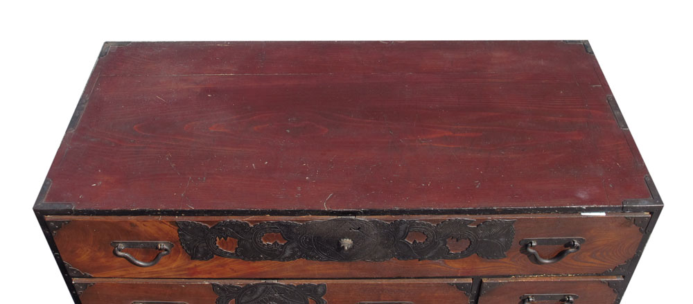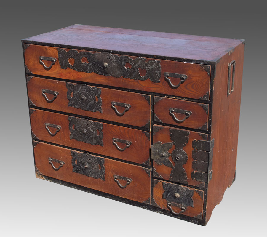 JAPANESE TONSU CHEST: Red stained finish with 8 drawers, iron hardware and fittings. 35 1/4'' h. x 45 1/2'' x 21 1/2''.