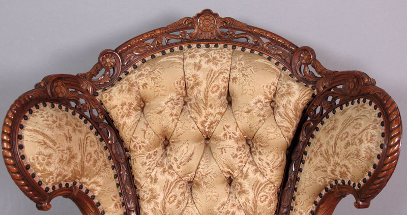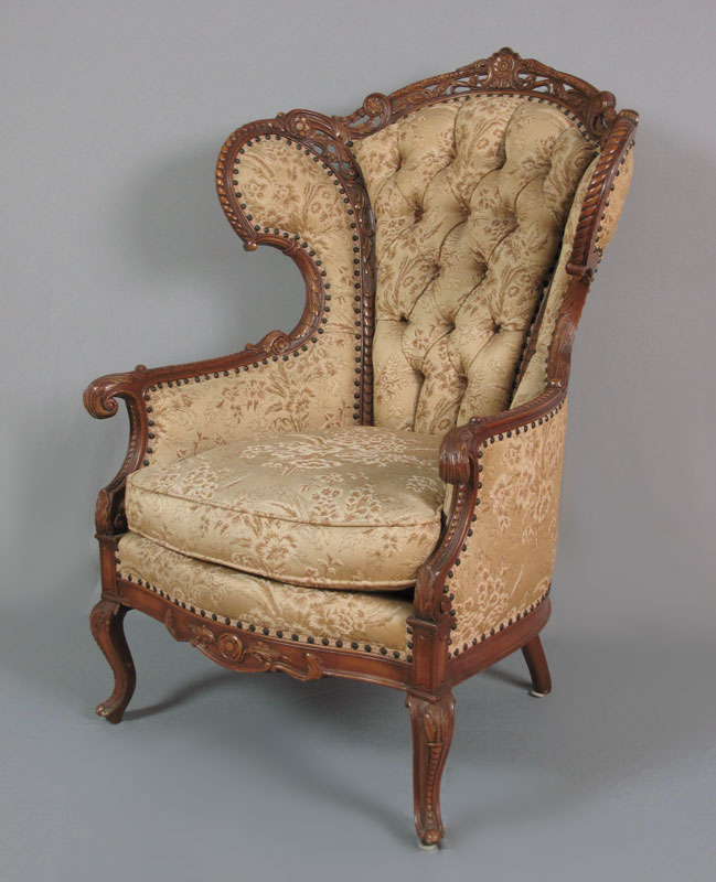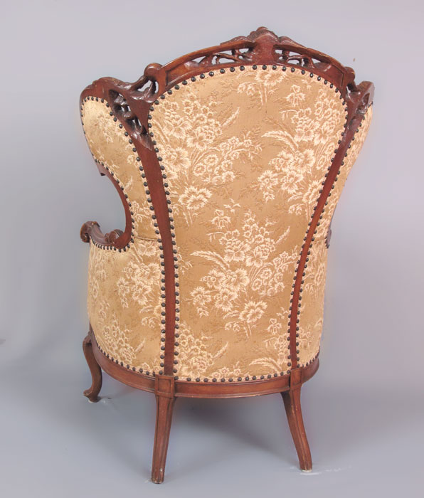 FRENCH STYLE CARVED PARLOR CHAIR: Elaborately carved and shaped with floral upholstery. 48'' h. x 32 1/2'' x 32''.