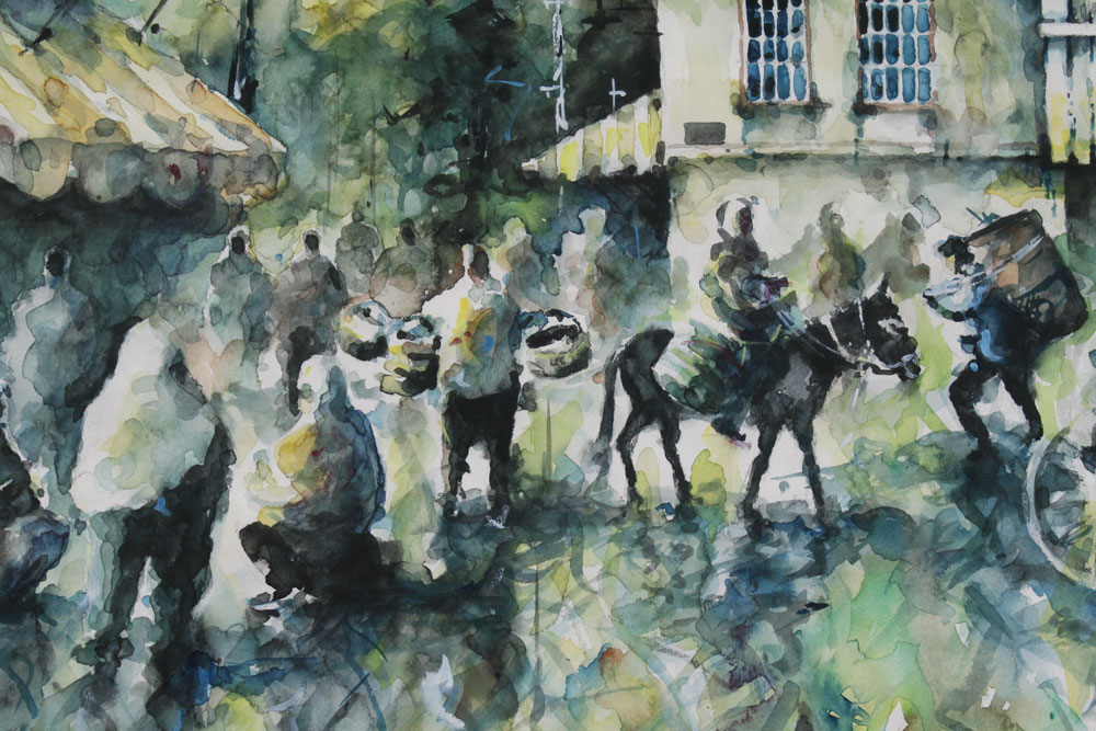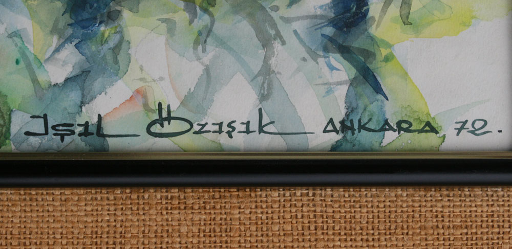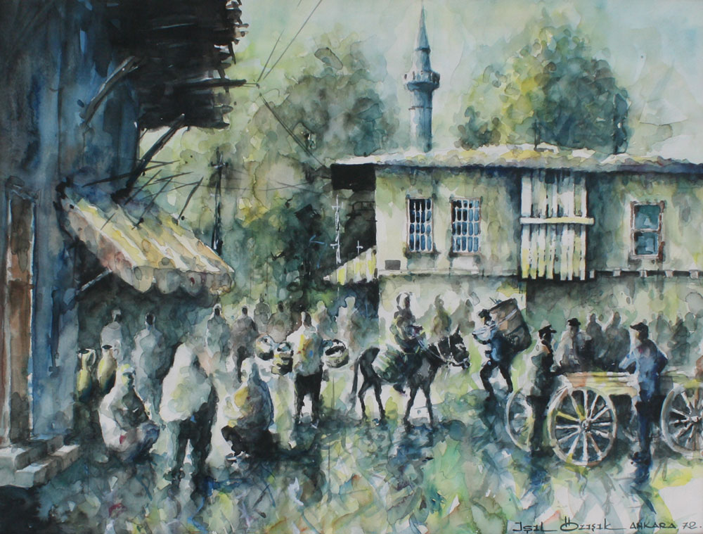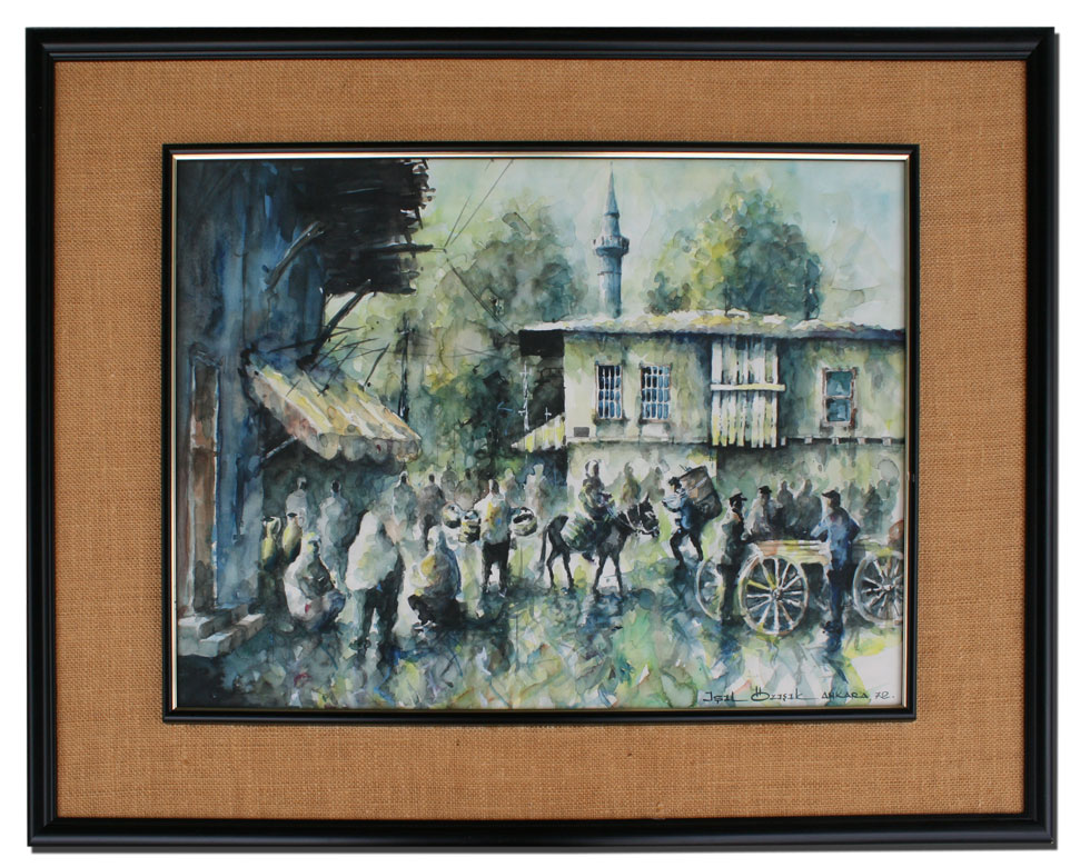OZISIK, Isil, (Turkish, 1939-): ''Ankara, 1972'', village scene with figures, Watercolor, sight size 18'' x 26'', signed titled and dated, framed, 27 1/2'' x 37''.
