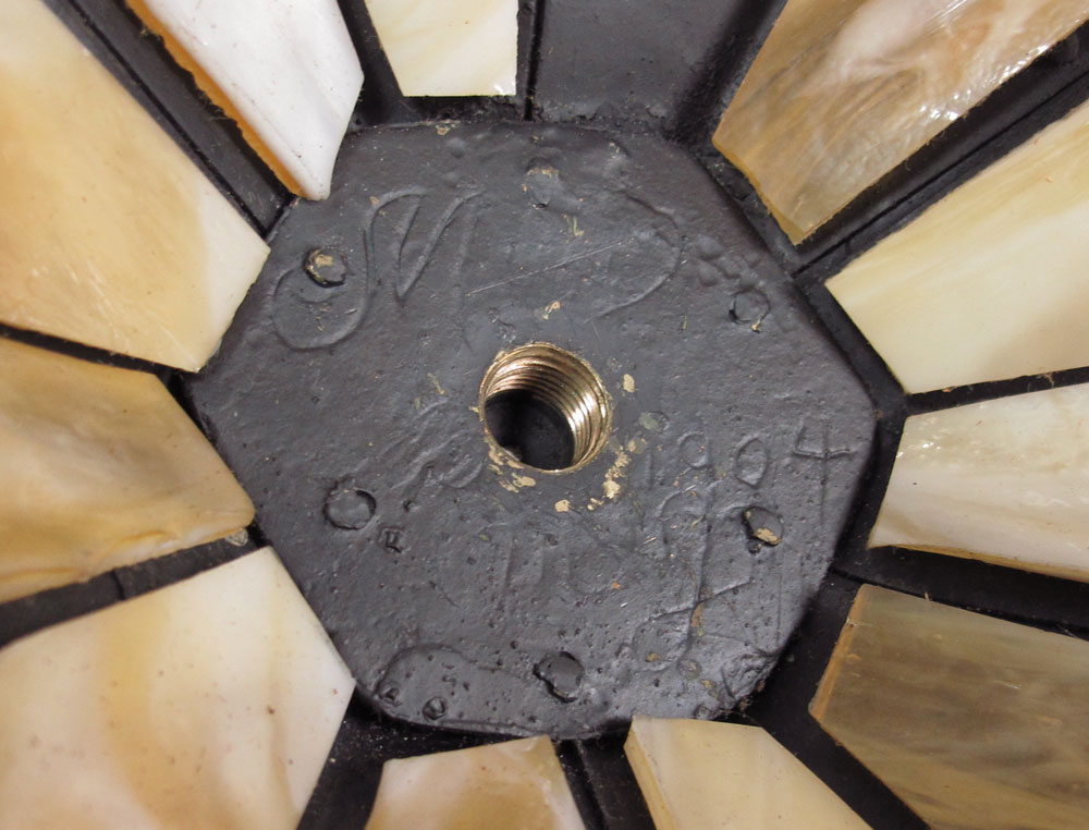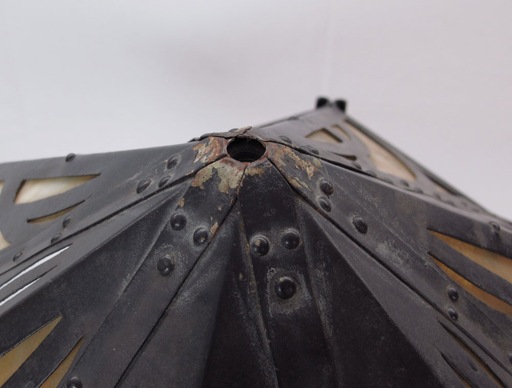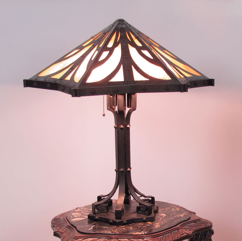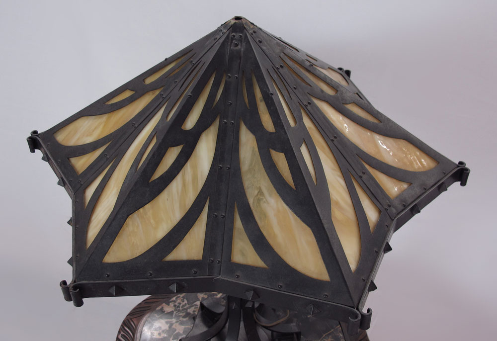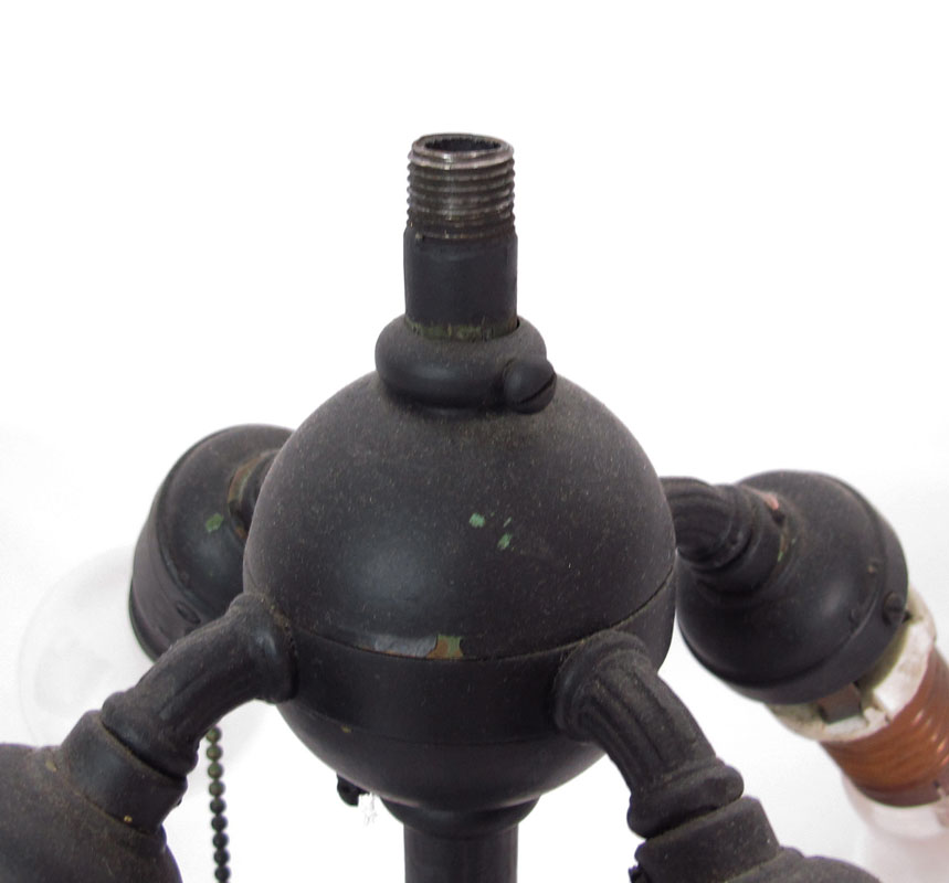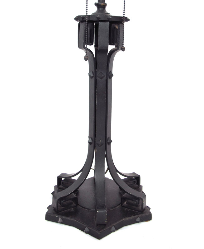 VINTAGE ARTS AND CRAFTS HIGH QUALITY TABLE LAMP: Unusual star form shade with 12 slag glass panels. 4 pull chain sockets (2 have chains intact). The iron base and sockets with a black painted finish. Approx. Illegible markings under the heat ring. 26 1/2''h., the shade is 25'' dia.