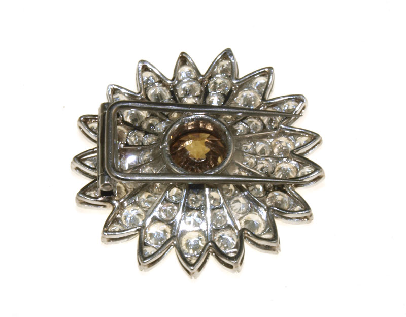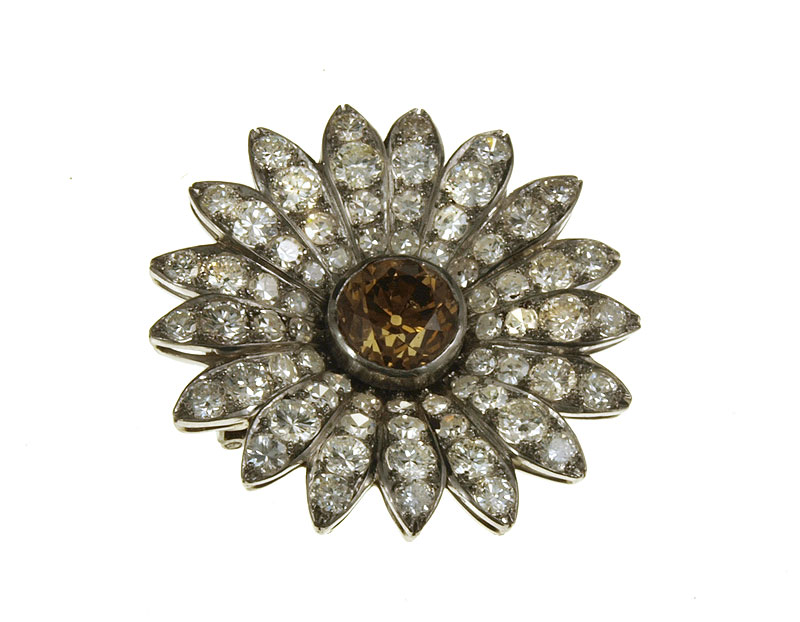 PLATINUM, DIAMOND AND NATURAL BROWN DIAMOND CLIP: Floral brooch of platinum centered by a bezel set 2.65 ct orangey brown old Euro cut diamond, SI1 clarity, petals bead set with 68 round single and brilliant cut diamonds, G-H-I color VS clarity,double stick pin finding, approx. 1 1/4''dia, 11.5 grams. Sold with current Florida Diamond Appraisers GIA appraisal, $20,000 retail replacement value.