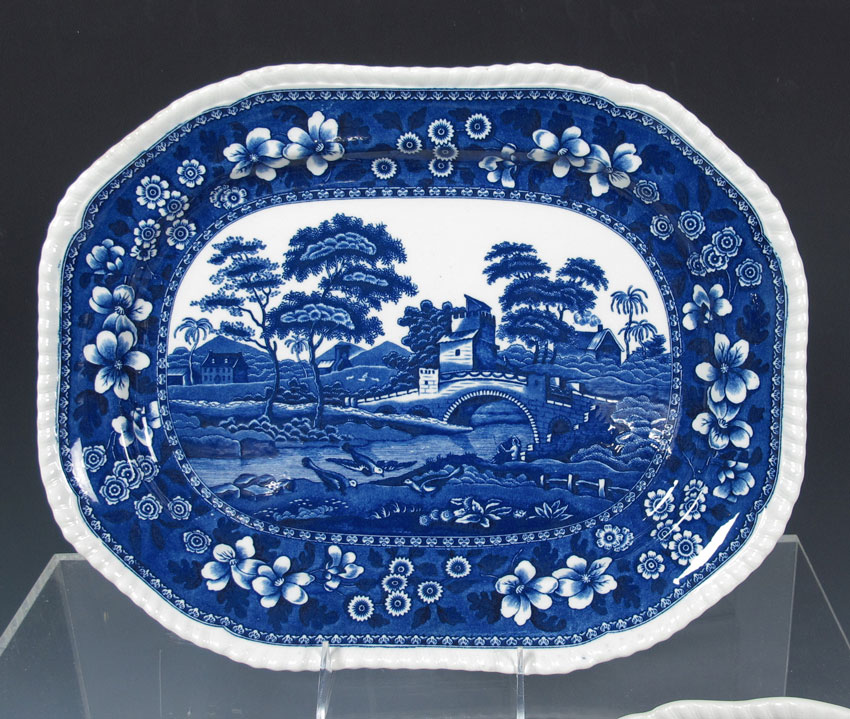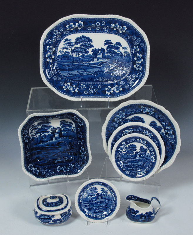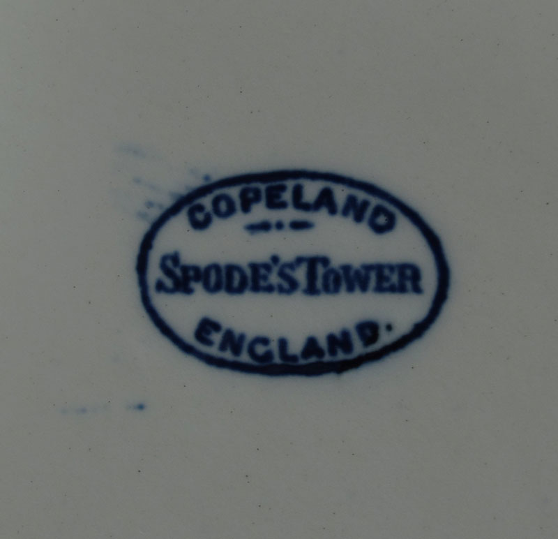 COPELAND SPODES TOWER DINNERWARE IN BLUE: 64 piece service for 12 to include 12 each of dinner plates, salad plates, bread plates, cups and saucers. Also the large platter, square vegetable bowl, creamer and sugar.
