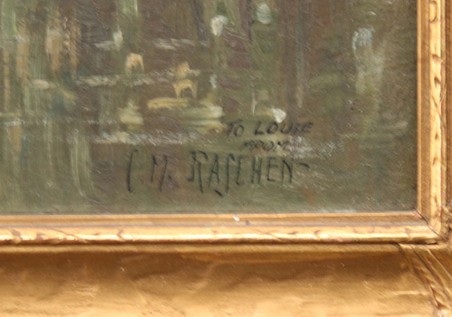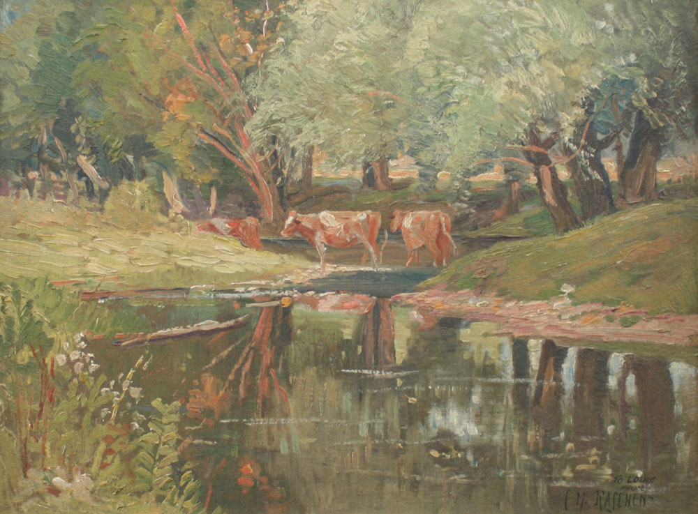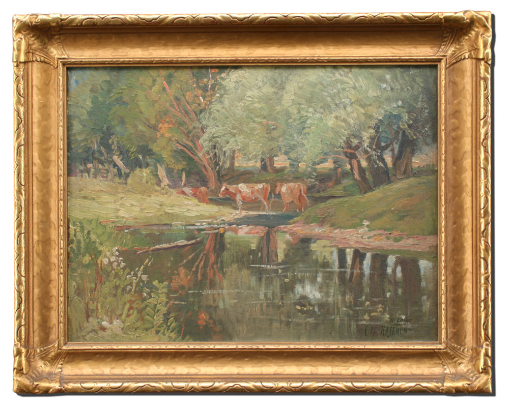 RASCHEN, Carl, (American, 1882-1962): Landscape With Cows Crossing Stream, OIL/Board, 12'' x 16'', signed and dedicated period gilded and carved frame with minor wear, 16'' x 20''.
